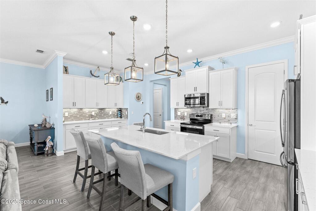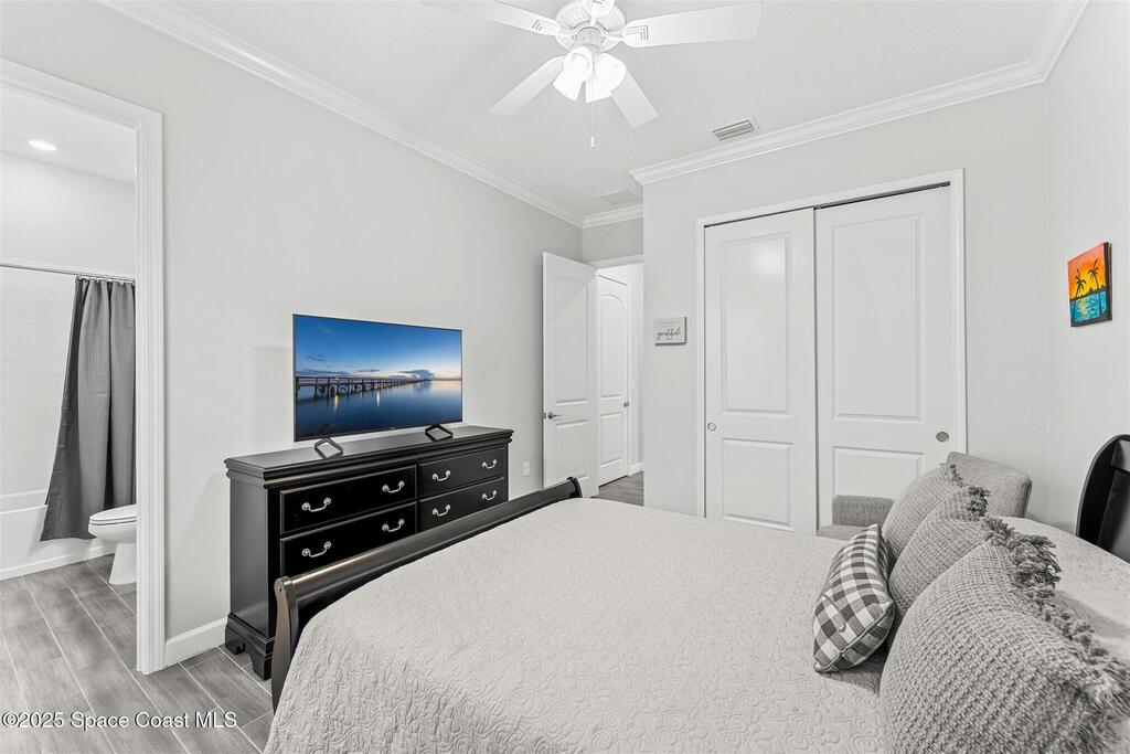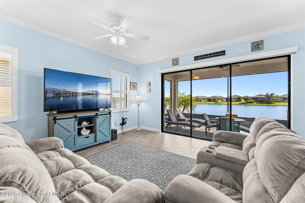 Pristine 3 bedroom plus study, 3 1/2 bath home in Bridgewater, Viera's popular 55+ resort style community! Move in ready with every upgrade: new porcelain tile plank floors throughout, crown molding, plantation shutters, screened in lanai, 8' doors, epoxy garage floors and more! Perfect for guests, every bedroom is an ensuite with its own bath! Large three panel sliders in great room bring the beautiful lake views into your home and set it apart from similar key largo style homes! The outside is as meticulous as the interior with stone trim enhancing the freshly painted exterior. As you approach the home, you will notice the stone landscape beds and impact glass etched front door. Accordion shutters are on all windows and sliders and a portable generator w/transformer switch add to your peace of mind. The private clubhouse offers a large, heated pool and spa, fitness center, tennis & pickleball courts and a movie theater! Short drive to ocean beaches, cruise ships, shopping, dining!