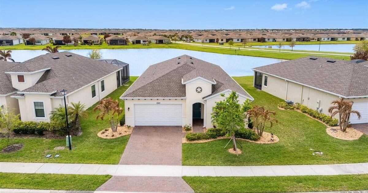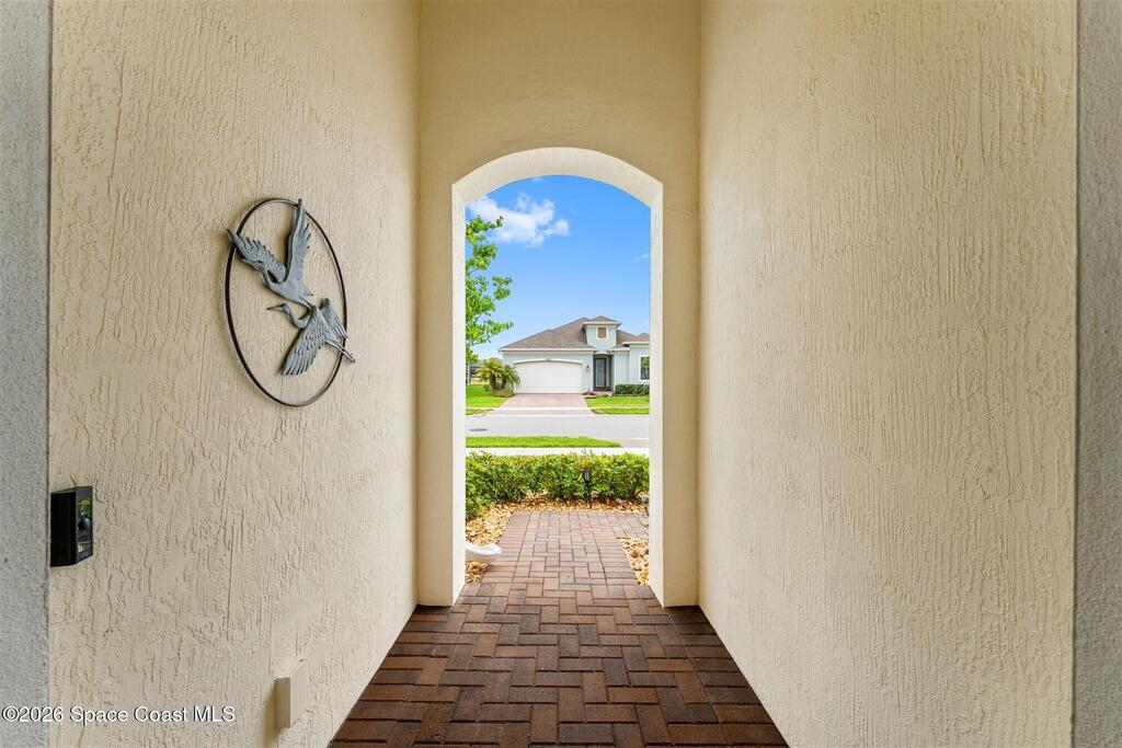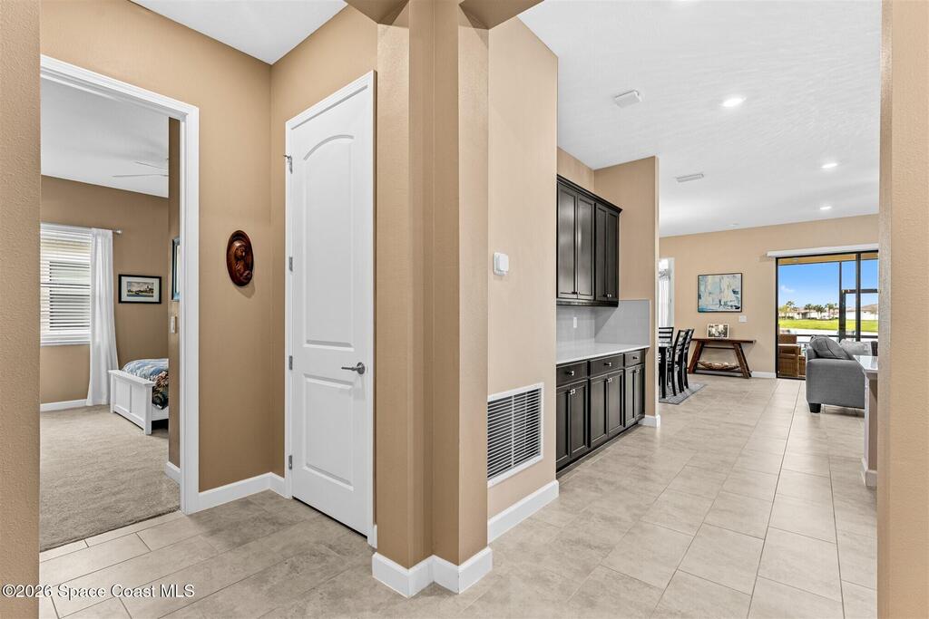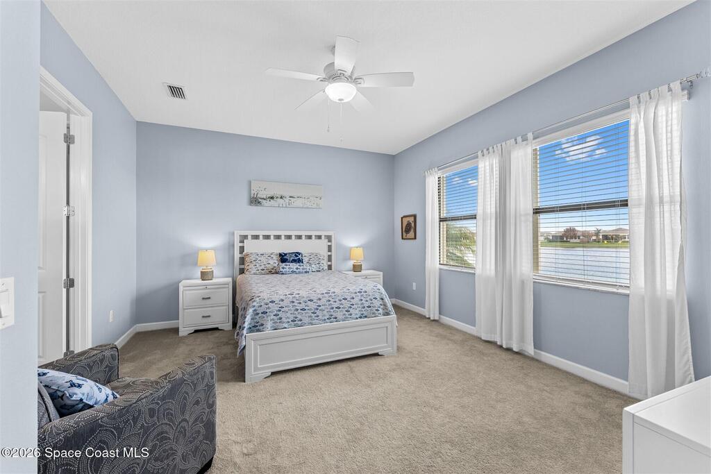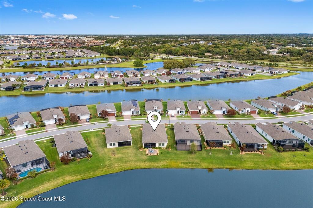 Immaculate 3 bedroom plus study, 3 1/2 bath, waterfront home in Bridgewater, Viera's popular gated 55+ resort style community. All three bedrooms are en-suites, making the Key Largo the most popular floorplan! This barely lived in home has plank tile floors in the main living areas, ceiling fans, and 8' doors. Great room has triple sliders to the screened in porch and additional paver patio and lake beyond! Exterior landscaped beds are bordered with designer curbing and stone. And all windows and the sliders have accordion shutters for added peace of mind! Delightful kitchen with espresso kitchen cabinets with tile backsplash and an island with stunning pendant lights! Dream laundry room with W/D, cabinets and a sink! Oversized primary bedroom and primary bath with a huge walk-in closet with custom built-ins! Unbelievable clubhouse w/ heated pool and spa, movie theater, fitness center, coffee lounge, tennis, pickleball! Close to shopping, restaurants, ocean beaches, cruise port!