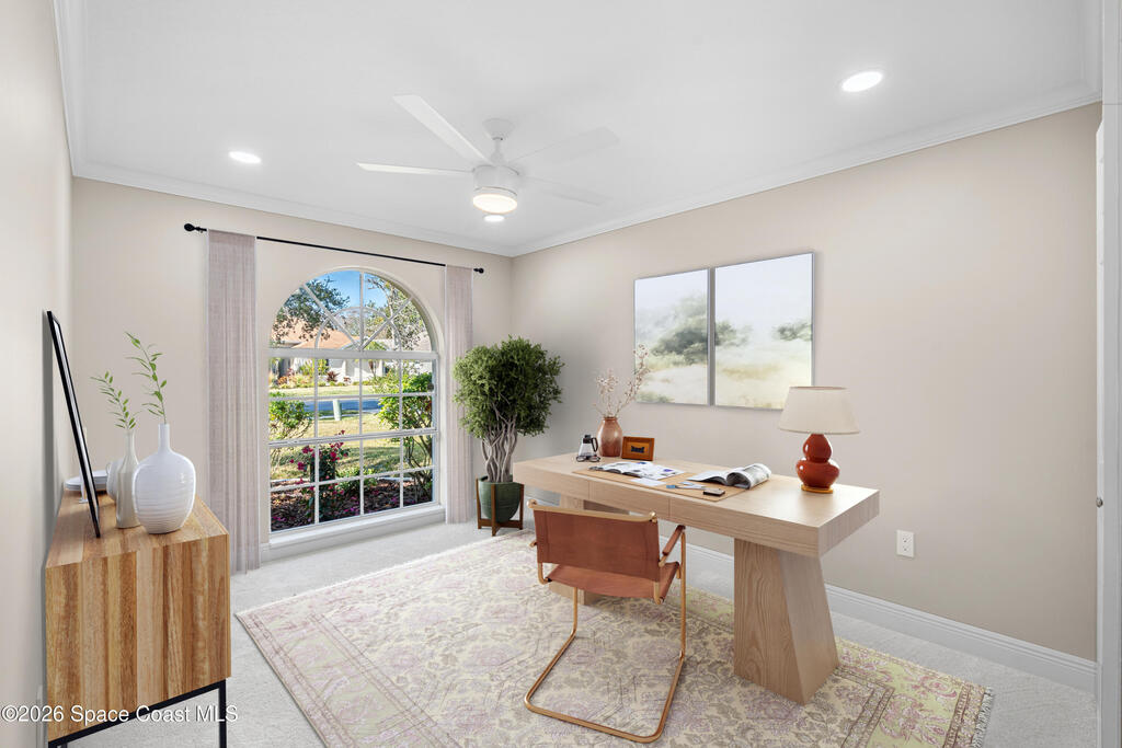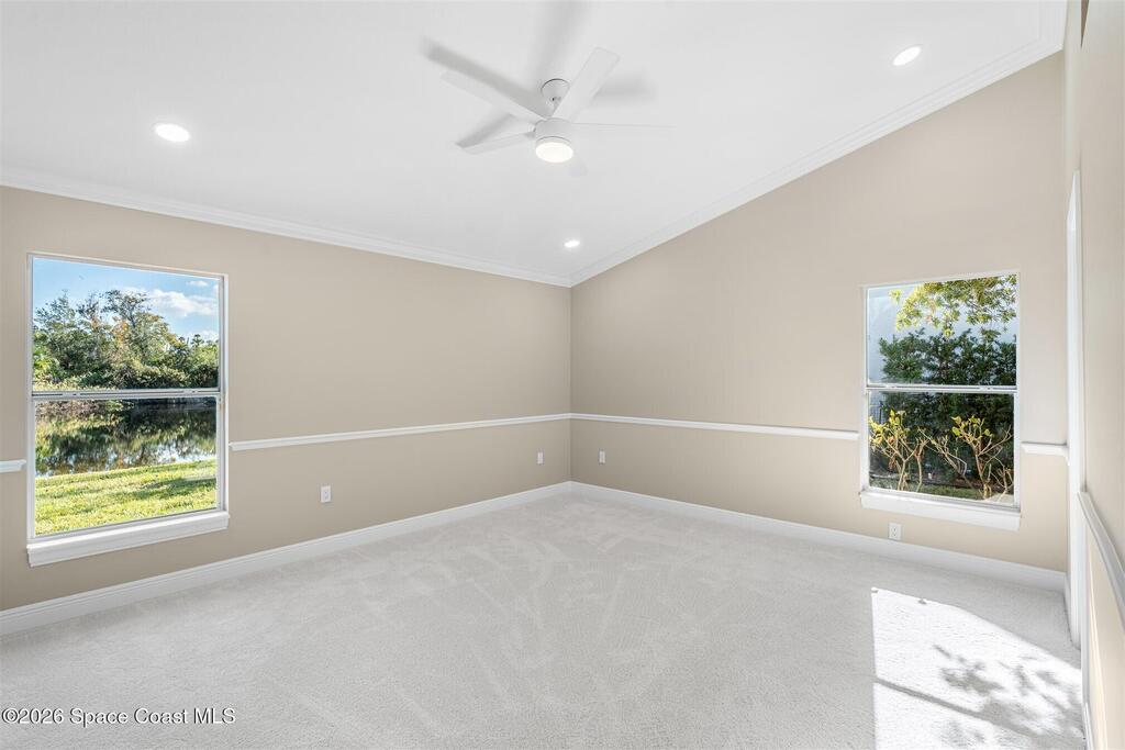 This custom-built waterfront home offers modern updates, and peaceful privacy. The entryway opens to serene backyard and water views, setting the tone for the home's thoughtful design. The exterior was freshly painted in 2026, including the patio deck and entire garage, and is complemented by updated landscaping and a shingle roof installed in 2018. Inside, the home shines with new carpet installed December 2025, fresh interior paint, new windowsills, and LED recessed lighting in every room. Additional upgrades include new outlets with screwless cover plates, six ceiling fans, and a washer and dryer installed in 2022. The updated kitchen features painted cabinets, a stylish backsplash, stainless steel appliances, and overlooks the tranquil waterfront. Crown molding throughout and chair rail accents add elegant detail. The primary suite offers a spacious bath, walk-in closet, and beautiful water views. This home blends custom design, modern comfort, and a special waterfront setting.