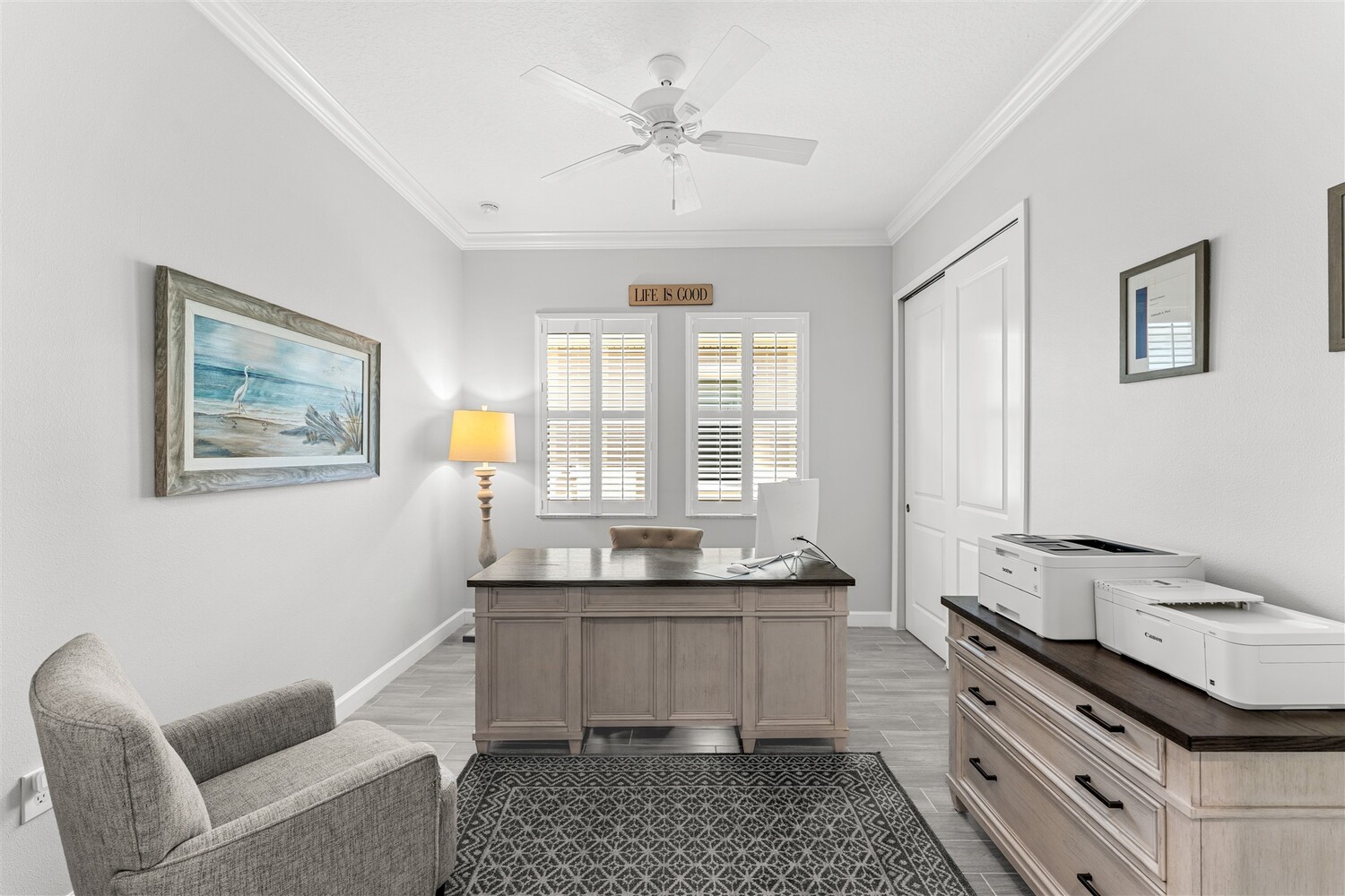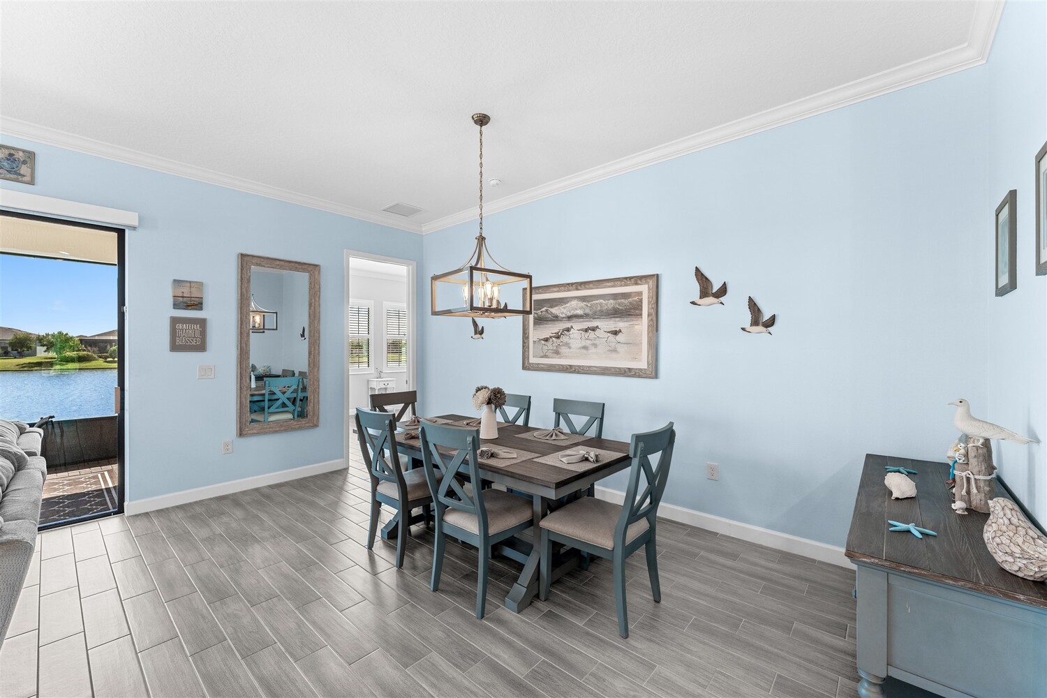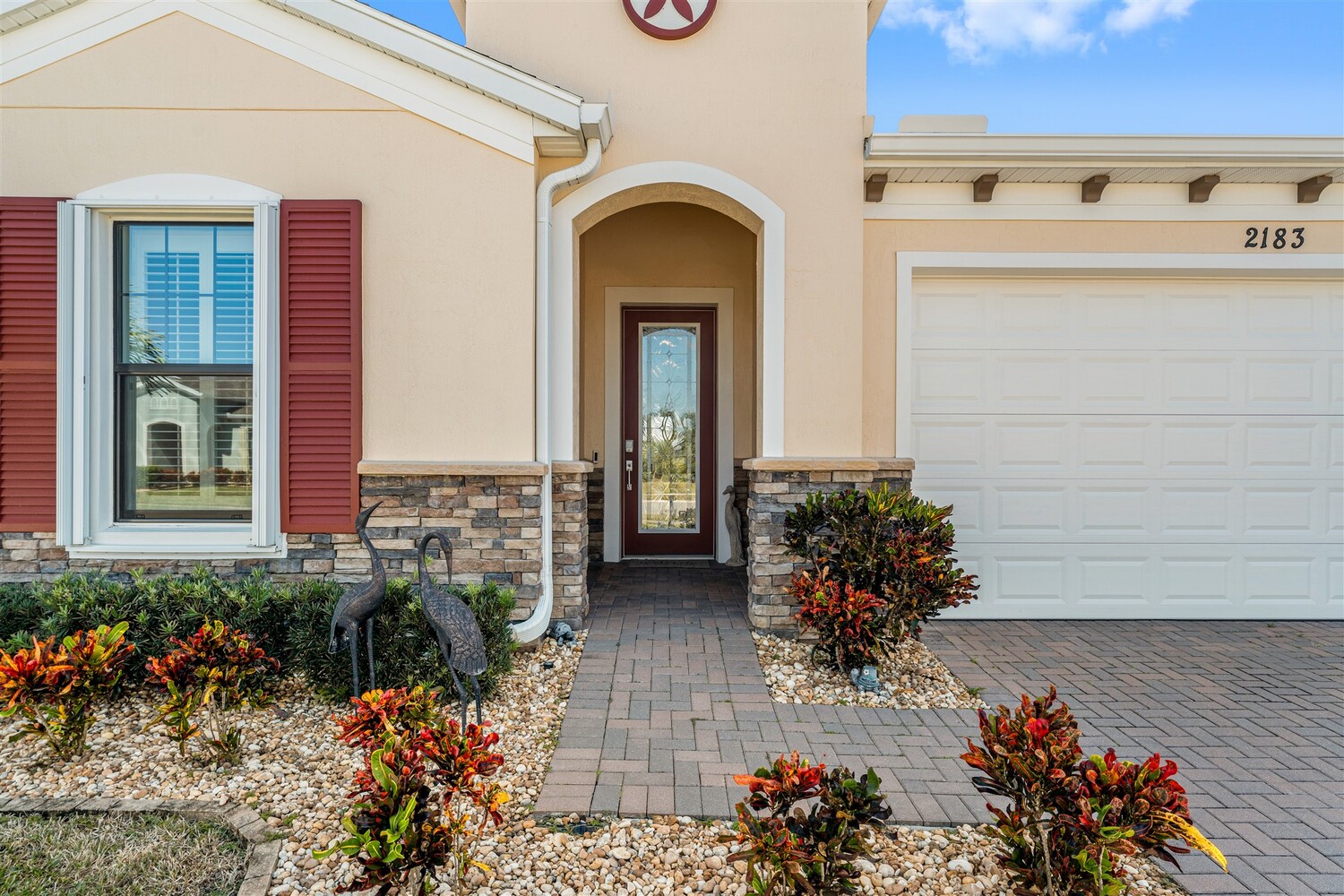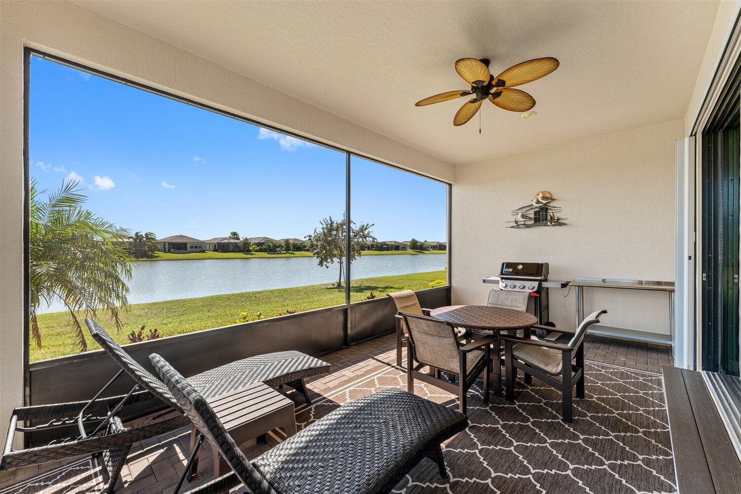 Pristine 3 bedroom plus study, 3 ½ bath home in Bridgewater, Viera's popular 55+ resort style community! Move in ready with every upgrade: new porcelain tile plank floors throughout, crown molding, plantation shutters, screened in lanai, 8' doors, epoxy garage floors and more! Perfect for guests, every bedroom is an ensuite with its own bath! Large three panel sliders in great room bring the beautiful lake views into your home and set it apart from similar key largo style homes! The outside is as meticulous as the interior with stone trim enhancing the freshly painted exterior. As you approach the home, you will notice the stone landscape beds and impact glass etched front door. Accordion shutters are on all windows and sliders and a transformer switch for a future generator add to your peace of mind. The private clubhouse offers a large heated pool and spa, fitness center, tennis & pickleball courts and a movie theater! Short drive to ocean beaches, cruise ships, shopping, dining!