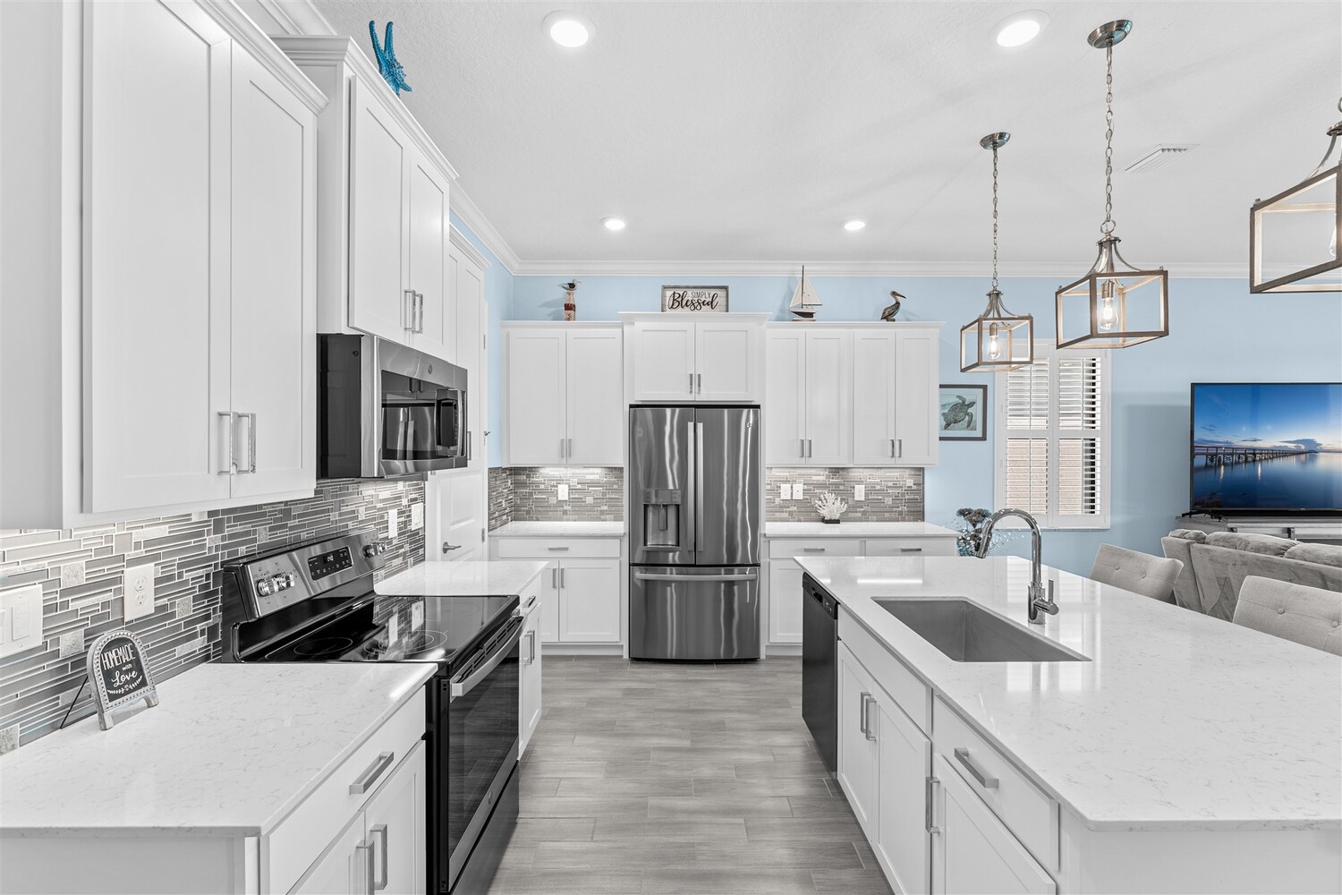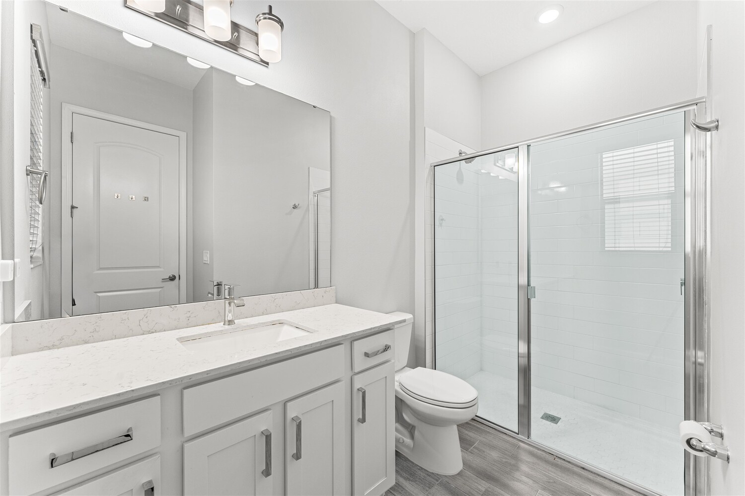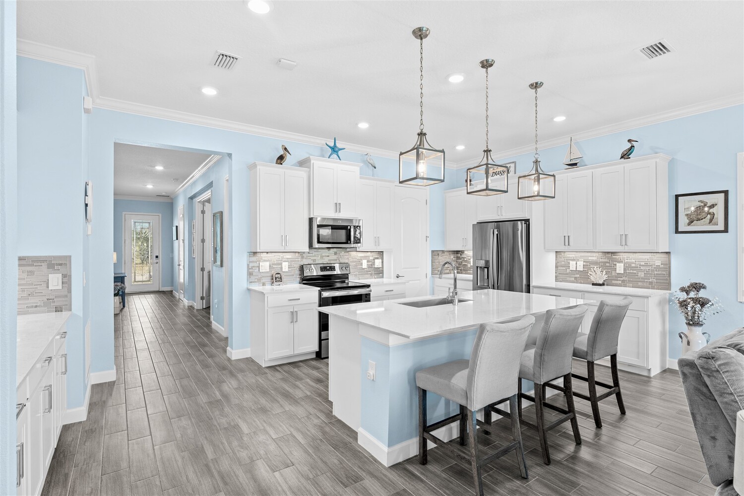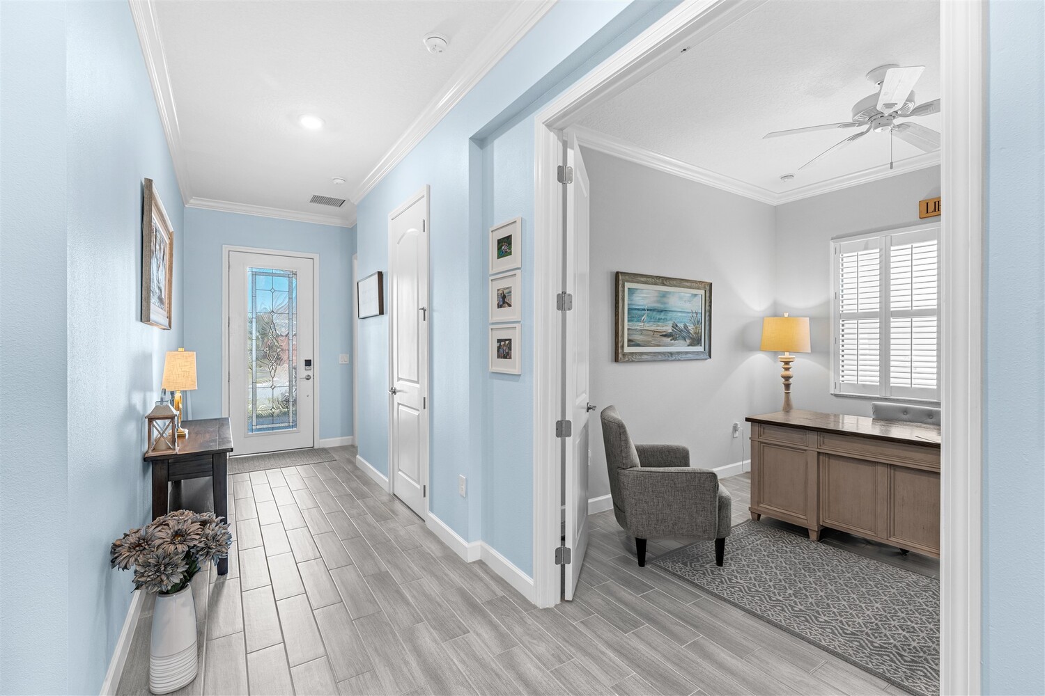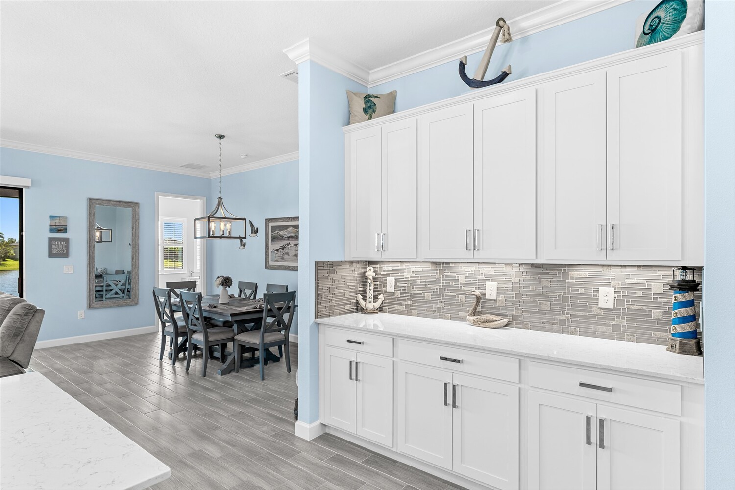 Pristine 3 bedroom plus study, 3 ½ bath home in Bridgewater, Viera's popular 55+ resort style community! Move in ready with every upgrade: new porcelain tile plank floors throughout, crown molding, plantation shutters, screened in lanai, 8' doors, epoxy garage floors and more! Perfect for guests, every bedroom is an ensuite with its own bath! Large three panel sliders in great room bring the beautiful lake views into your home and set it apart from similar key largo style homes! The outside is as meticulous as the interior with stone trim enhancing the freshly painted exterior. As you approach the home, you will notice the stone landscape beds and impact glass etched front door. Accordion shutters are on all windows and sliders and a transformer switch for a future generator add to your peace of mind. The private clubhouse offers a large heated pool and spa, fitness center, tennis & pickleball courts and a movie theater! Short drive to ocean beaches, cruise ships, shopping, dining!
