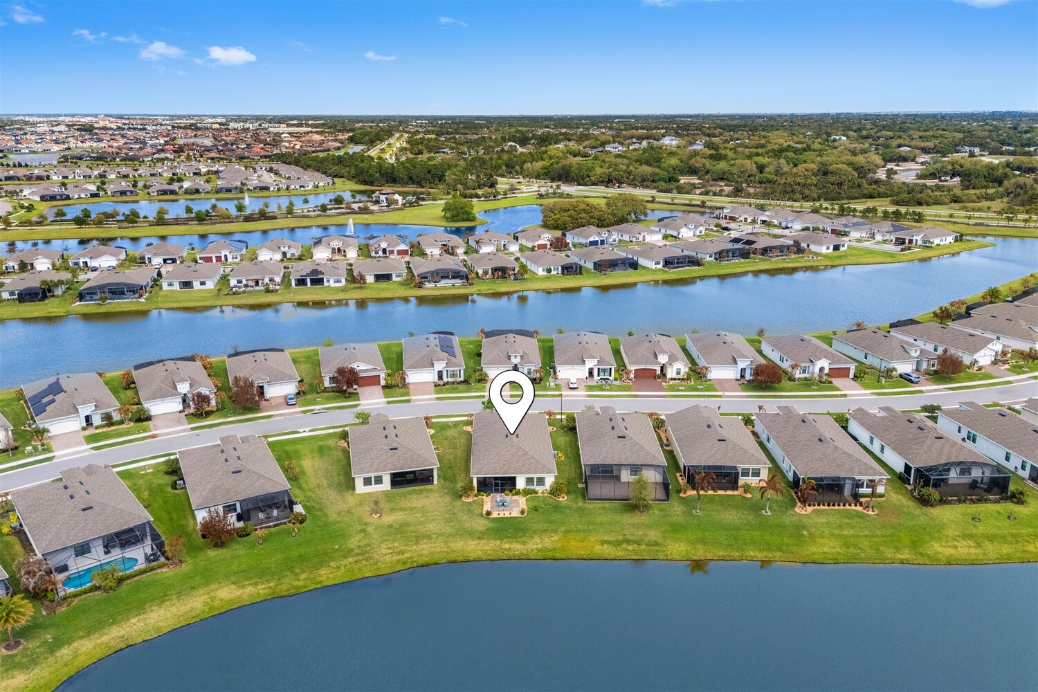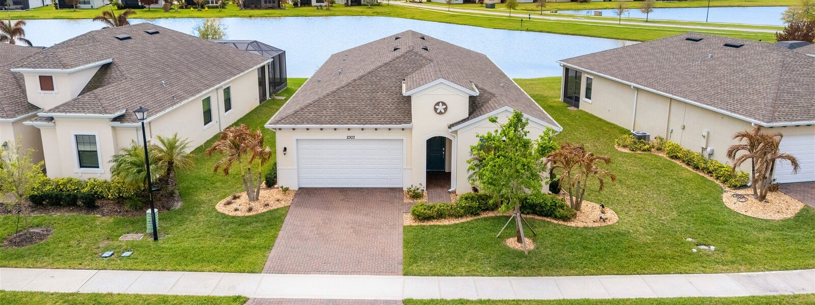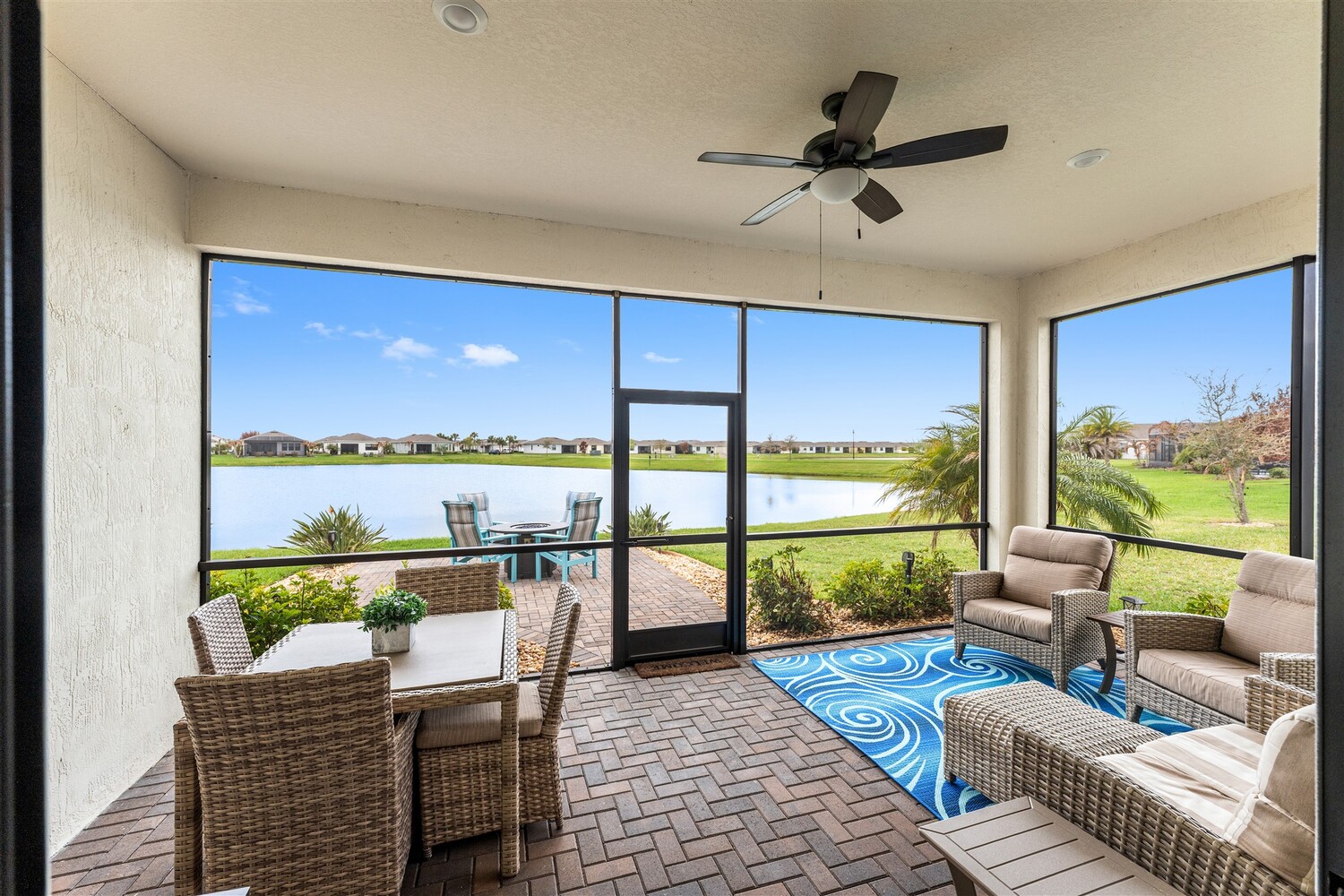 Immaculate 3 bedroom plus study, 3 1/2 bath, waterfront home in Bridgewater, Viera's popular gated 55+ resort style community. All three bedrooms are en-suites, making the Key Largo the most popular floorplan! This barely lived in home has plank tile floors in the main living areas, ceiling fans, and 8' doors. Great room has triple sliders to the screened in porch and additional paver patio and lake beyond! Exterior landscaped beds are bordered with designer curbing and stone. And all windows and the sliders have accordion shutters for added peace of mind! Delightful kitchen with espresso kitchen cabinets with tile backsplash and an island with stunning pendant lights! Dream laundry room with W/D, cabinets and a sink! Oversized primary bedroom and primary bath with a huge walk-in closet with custom built-ins! Unbelievable clubhouse w/ heated pool and spa, movie theater, fitness center, coffee lounge, tennis, pickleball! Close to shopping, restaurants, ocean beaches, cruise port!