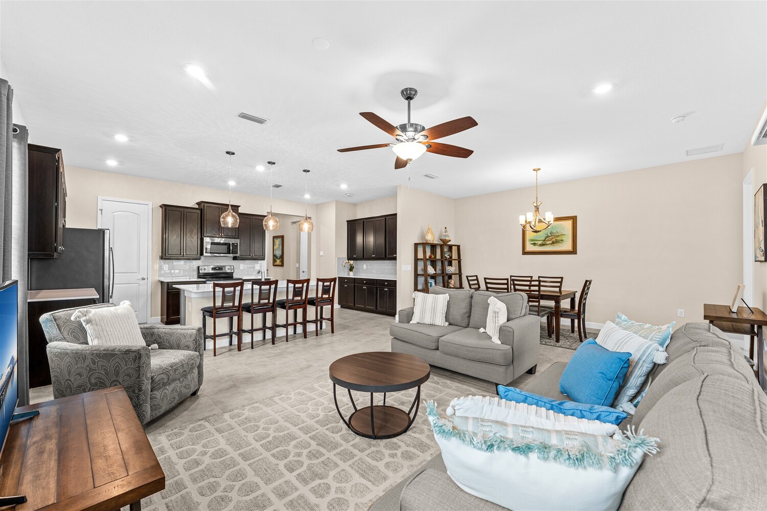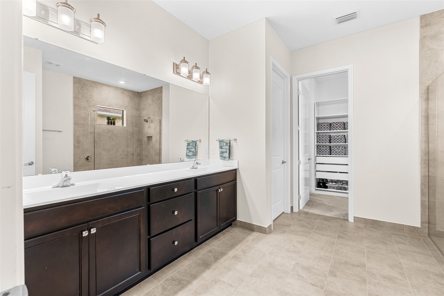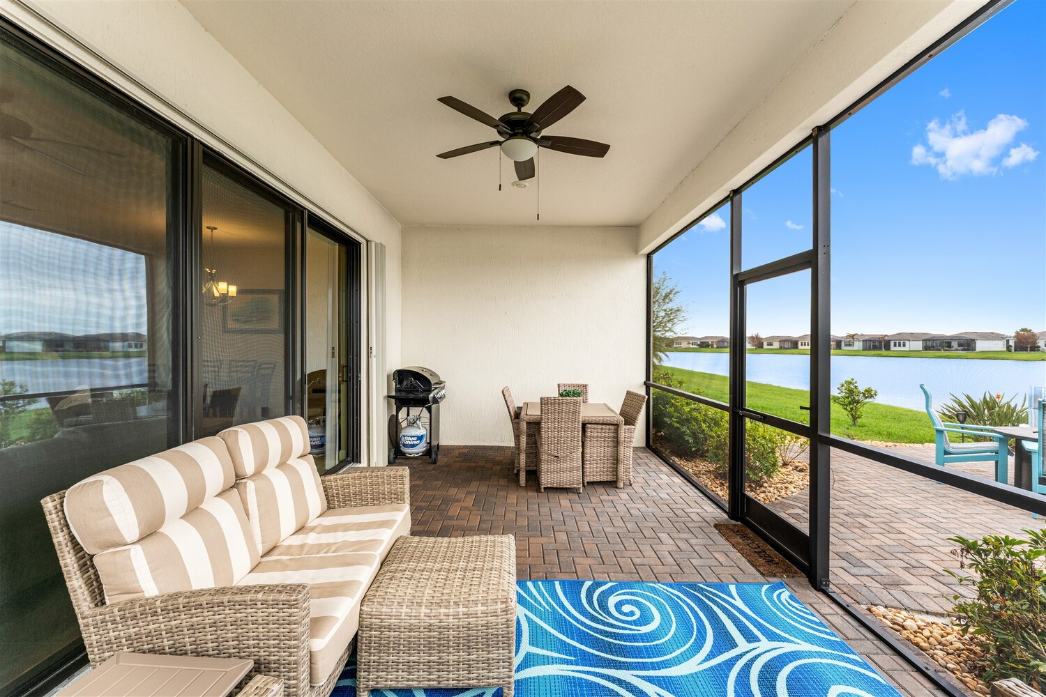 Immaculate 3 bedroom plus study, 3 1/2 bath, waterfront home in Bridgewater, Viera's popular gated 55+ resort style community. All three bedrooms are en-suites, making the Key Largo the most popular floorplan! This barely lived in home has plank tile floors in the main living areas, ceiling fans, and 8' doors. Great room has triple sliders to the screened in porch and additional paver patio and lake beyond! Exterior landscaped beds are bordered with designer curbing and stone. And all windows and the sliders have accordion shutters for added peace of mind! Delightful kitchen with espresso kitchen cabinets with tile backsplash and an island with stunning pendant lights! Dream laundry room with W/D, cabinets and a sink! Oversized primary bedroom and primary bath with a huge walk-in closet with custom built-ins! Unbelievable clubhouse w/ heated pool and spa, movie theater, fitness center, coffee lounge, tennis, pickleball! Close to shopping, restaurants, ocean beaches, cruise port!