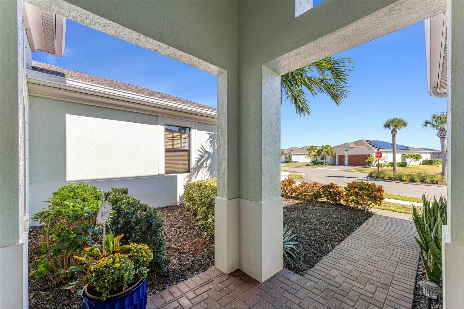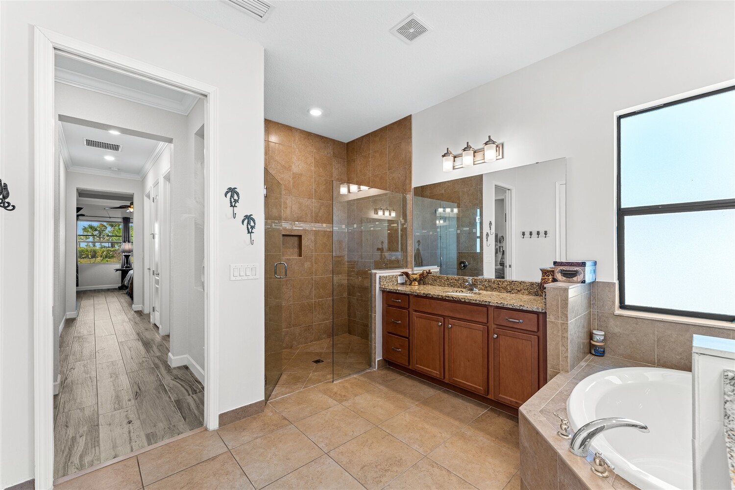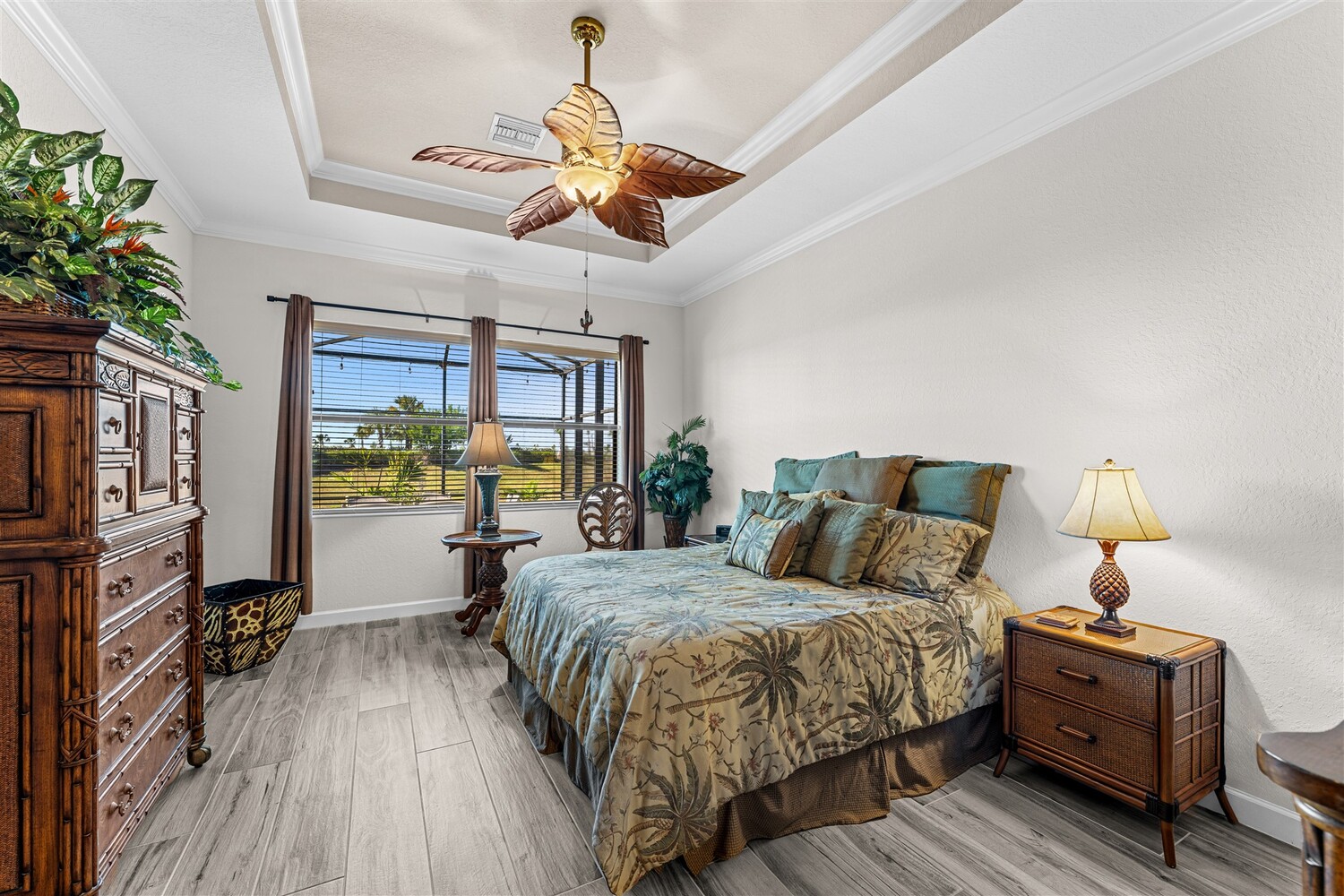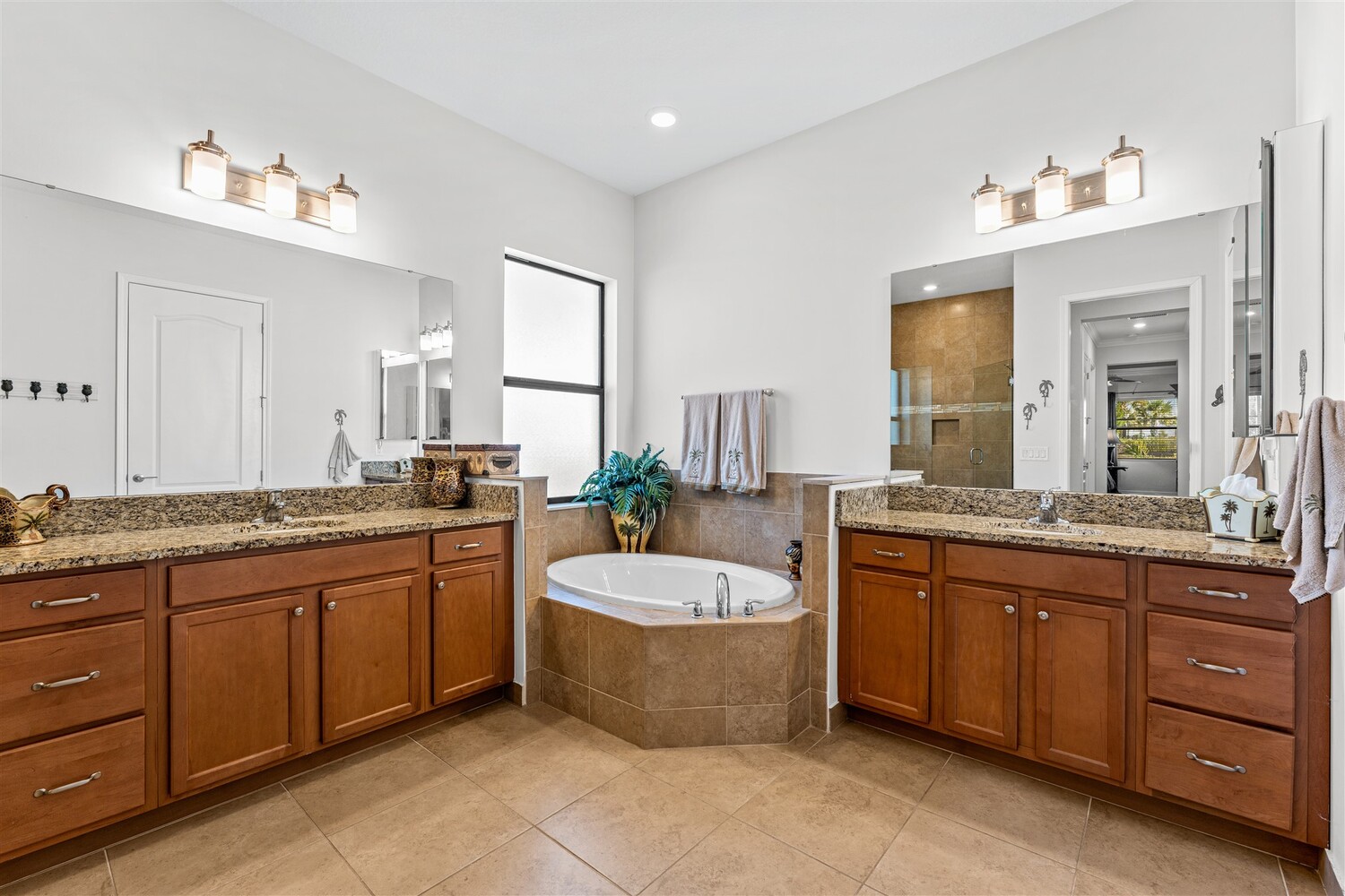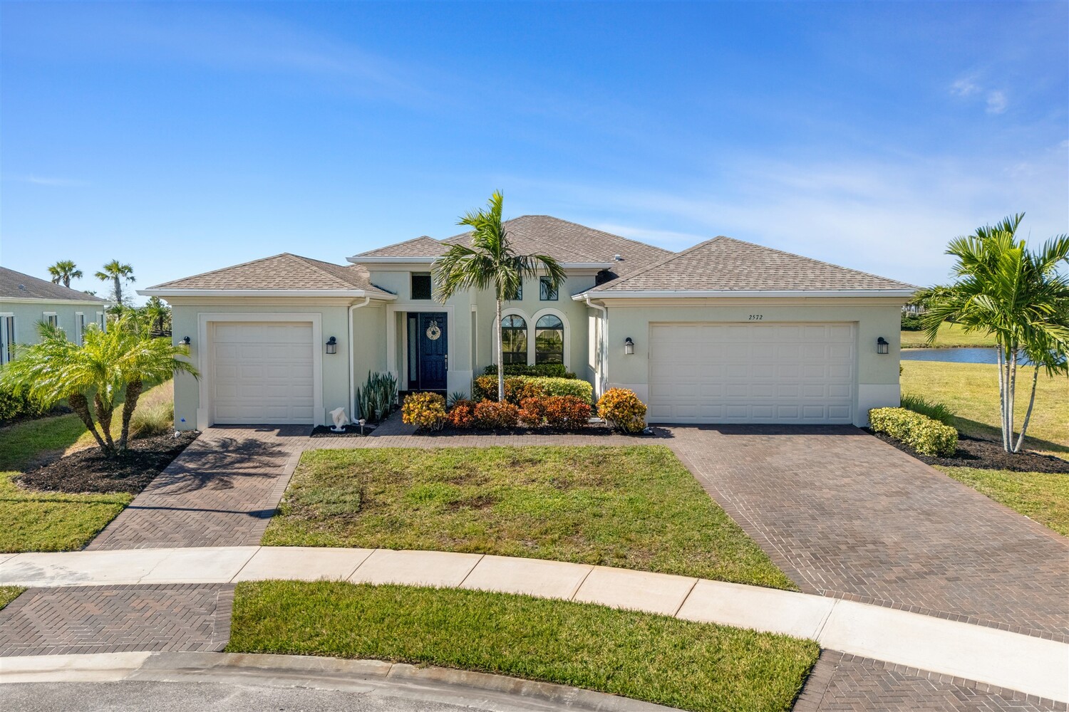 Situated on a .47-acre lot in Bridgewater, Viera's prime 55+ community, this rare sought-after Boretto plan has 3 bedrooms plus a study w/ glass doors and closet, 3 baths, garages for 3 cars and includes a front courtyard flanked by a two-car garage and a separate one car garage! Imagine having two sealed paver driveways! Must have features include tile throughout, 8' doors, tray ceilings, crown moldings, and four sliders that lead to an expanded screened lanai! The gourmet kitchen delights with stunning newer designer quartz kitchen counters, enlarged island w/disposal button and touch faucet, upgraded refrigerator and d/w, and custom shelves in pantry. Enter primary bedroom through double doors into a true retreat with luxury bath w/tub and separate tile shower, tray ceiling, walk-in closet with dual entries and built-ins! Active 55+ gated community offers a resort style clubhouse with heated pool/spa, fitness center, movie theater, tennis & pickleball courts and HOA does lawncare