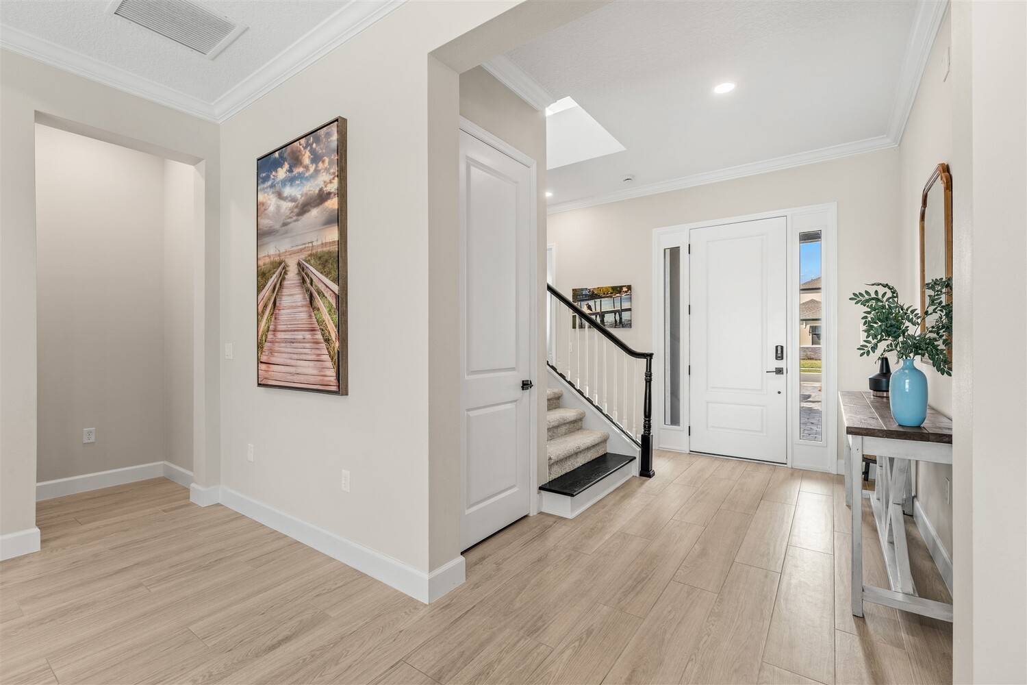 Experience refined living in the gated Laurasia community of Viera, a premier golf cart-friendly neighborhood celebrated for its elegance and convenience. This stunning two-story home offers 5 bedrooms, 4.5 baths, and a side-entry 2-car plus golf cart garage. The open-concept design centers around a gourmet kitchen featuring Level 5 cabinetry, quartz countertops, a pot filler, and a reverse osmosis system. Relax or entertain in the panoramic screened pool area, complete with shell lock pavers for slip-resistant style and fully automated Hayward pool controls for effortless enjoyment. The luxurious primary suite includes a spa-like bath with soaking tub and separate shower. Additional upgrades include a tankless natural gas water heater for endless efficiency. Zoned for A-rated Viera Elementary, Middle, and High School, this home blends exceptional craftsmanship with the vibrant Viera lifestyle.