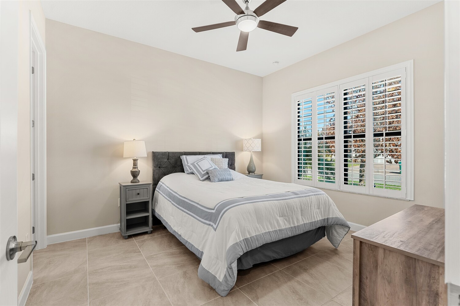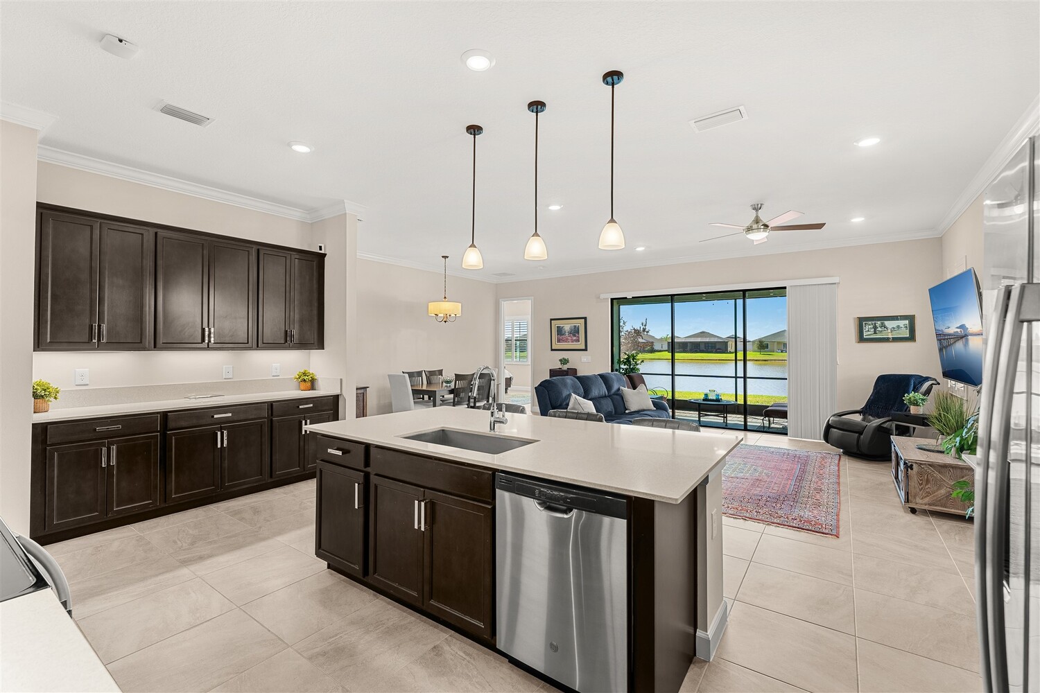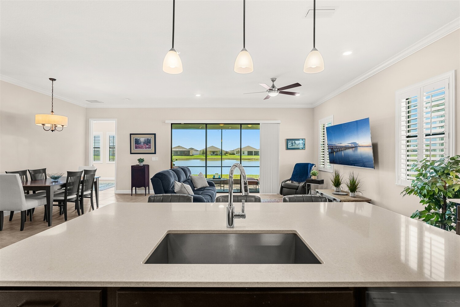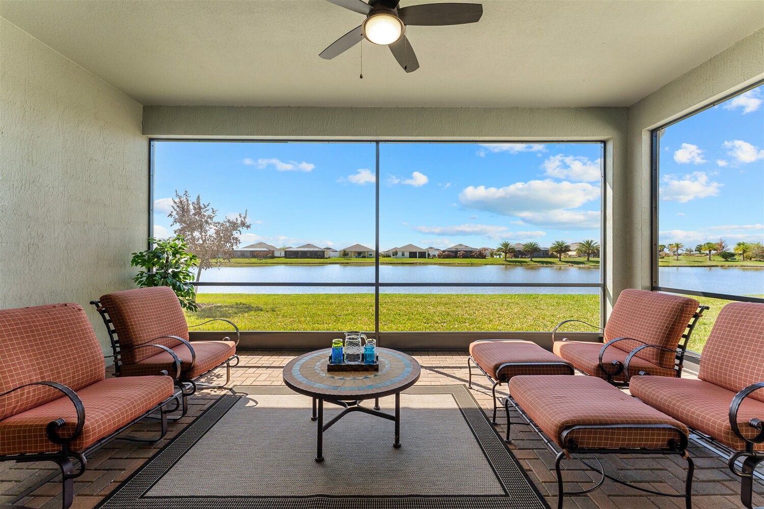 Enjoy waterfront views from this airy 3-bedroom, 4-bath home in the gated 55+ community Bridgewater at Viera. A den/flex room with double doors and closet can easily serve as a fourth bedroom. The kitchen features quartz countertops, stainless steel appliances, and an oversized island that opens to the main living area. Triple sliding glass doors fill the home with natural light and lead to a screened lanai overlooking the water--perfect for enjoying both sunrise and sunset. Interior highlights include ceramic tile flooring, plantation shutters, crown molding, recessed LED lighting, upgraded fixtures, and a laundry room with sink and built-in cabinets. The primary suite offers a custom walk-in closet, zero-entry shower, and dual vanities. Guest bedrooms include custom closets and en-suite baths, one with a walk-in Jacuzzi tub. Resort-style amenities include heated pool, fitness center, tennis, pickleball, bocce, billiards, movie theater. HOA includes lawn care, garbage, gated security.