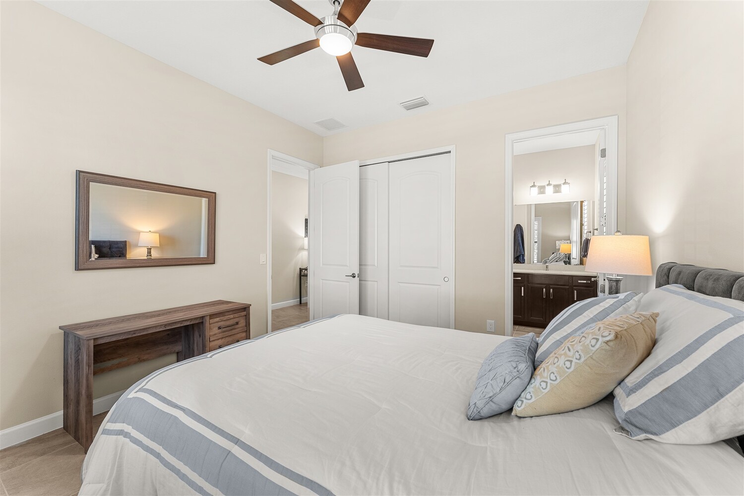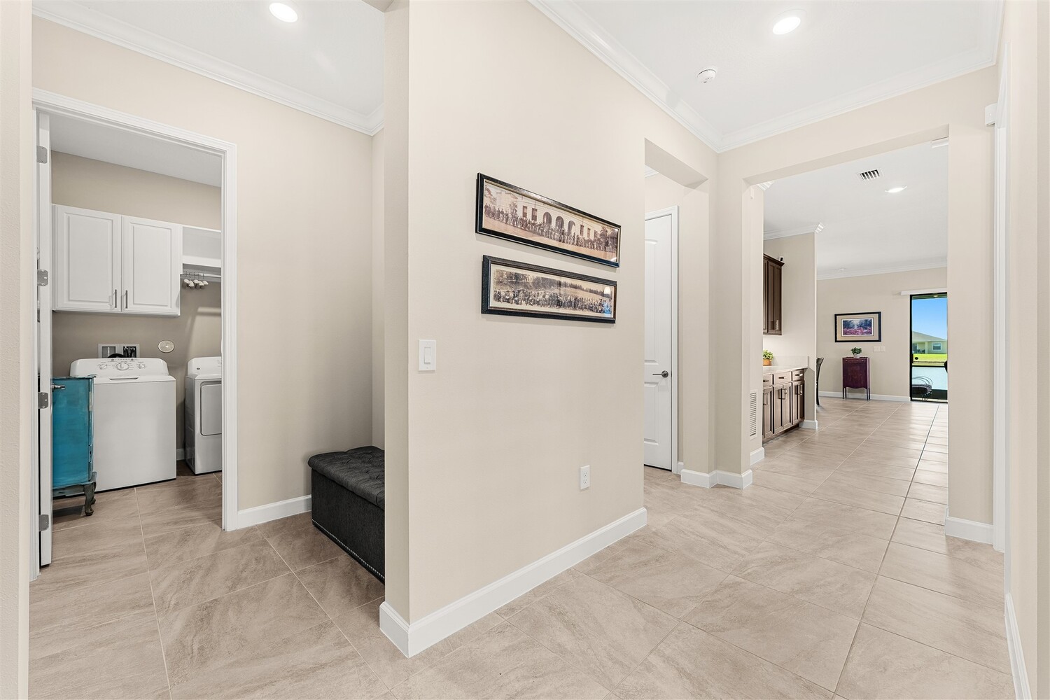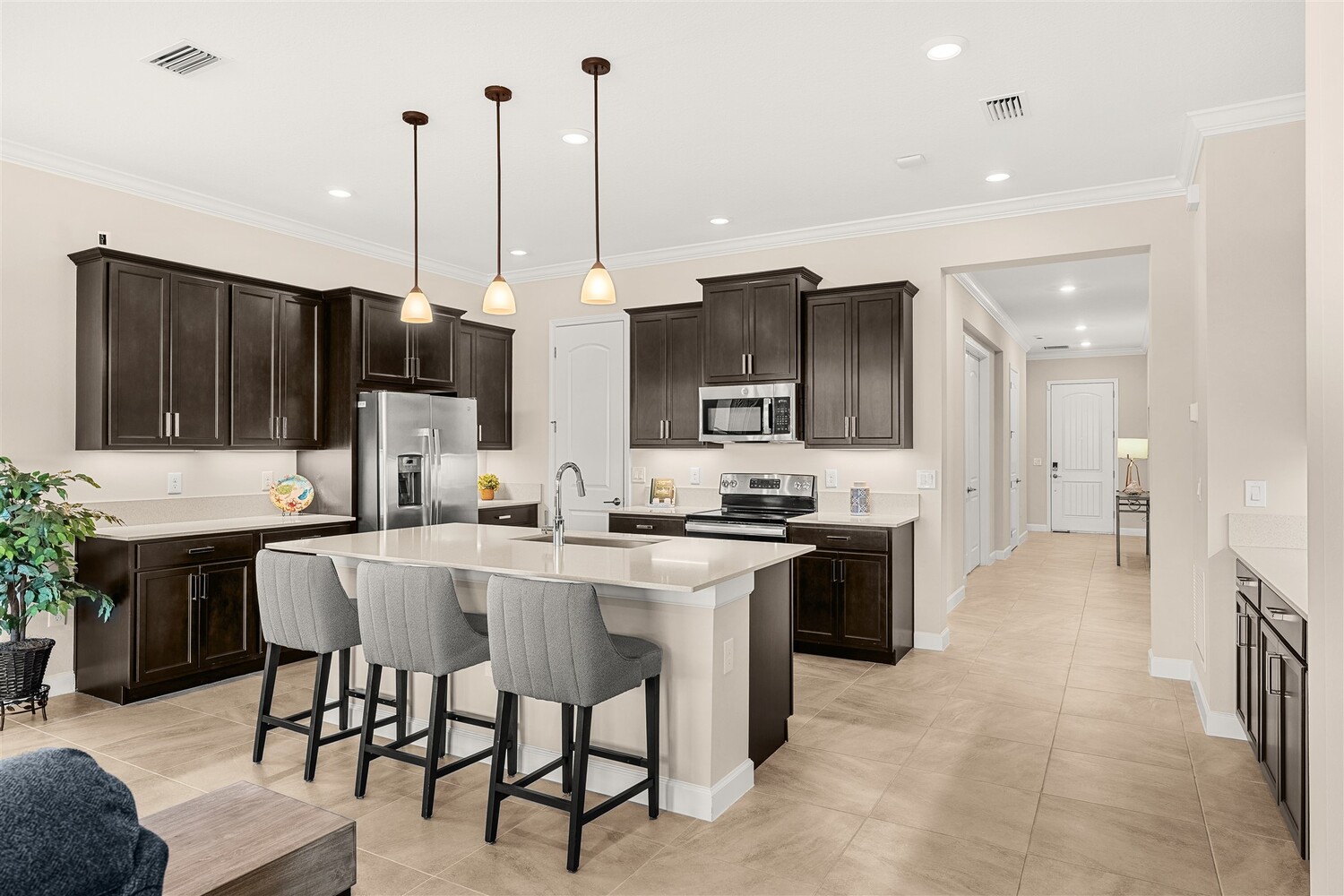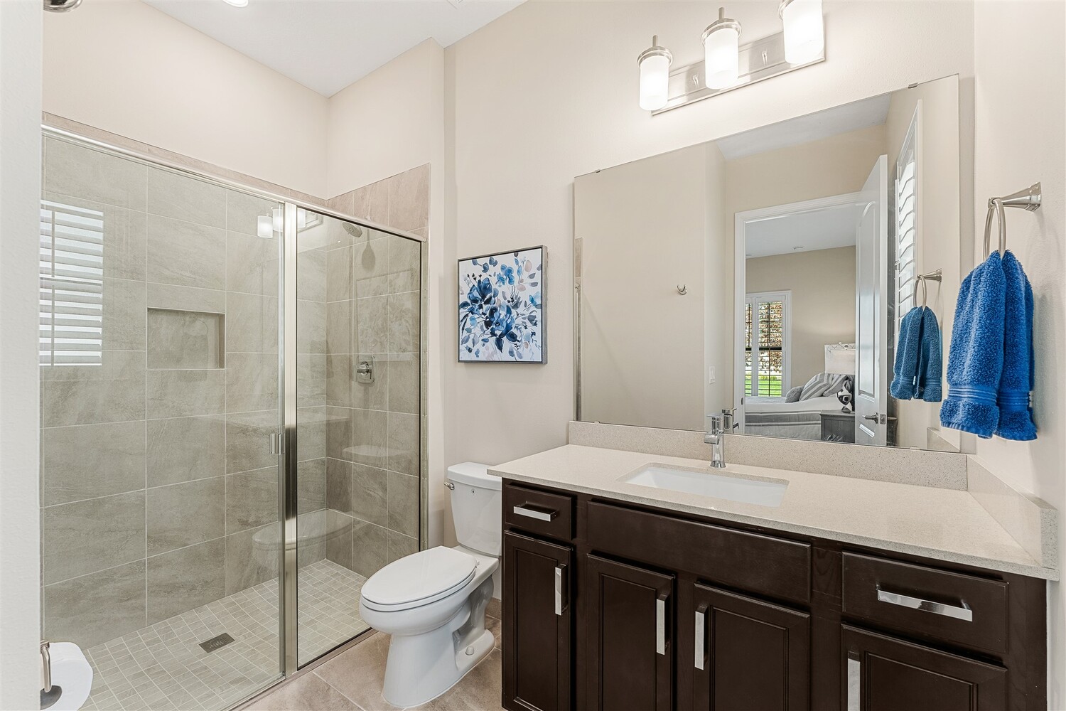 Enjoy waterfront views from this airy 3-bedroom, 4-bath home in the gated 55+ community Bridgewater at Viera. A den/flex room with double doors and closet can easily serve as a fourth bedroom. The kitchen features quartz countertops, stainless steel appliances, and an oversized island that opens to the main living area. Triple sliding glass doors fill the home with natural light and lead to a screened lanai overlooking the water--perfect for enjoying both sunrise and sunset. Interior highlights include ceramic tile flooring, plantation shutters, crown molding, recessed LED lighting, upgraded fixtures, and a laundry room with sink and built-in cabinets. The primary suite offers a custom walk-in closet, zero-entry shower, and dual vanities. Guest bedrooms include custom closets and en-suite baths, one with a walk-in Jacuzzi tub. Resort-style amenities include heated pool, fitness center, tennis, pickleball, bocce, billiards, movie theater. HOA includes lawn care, garbage, gated security.