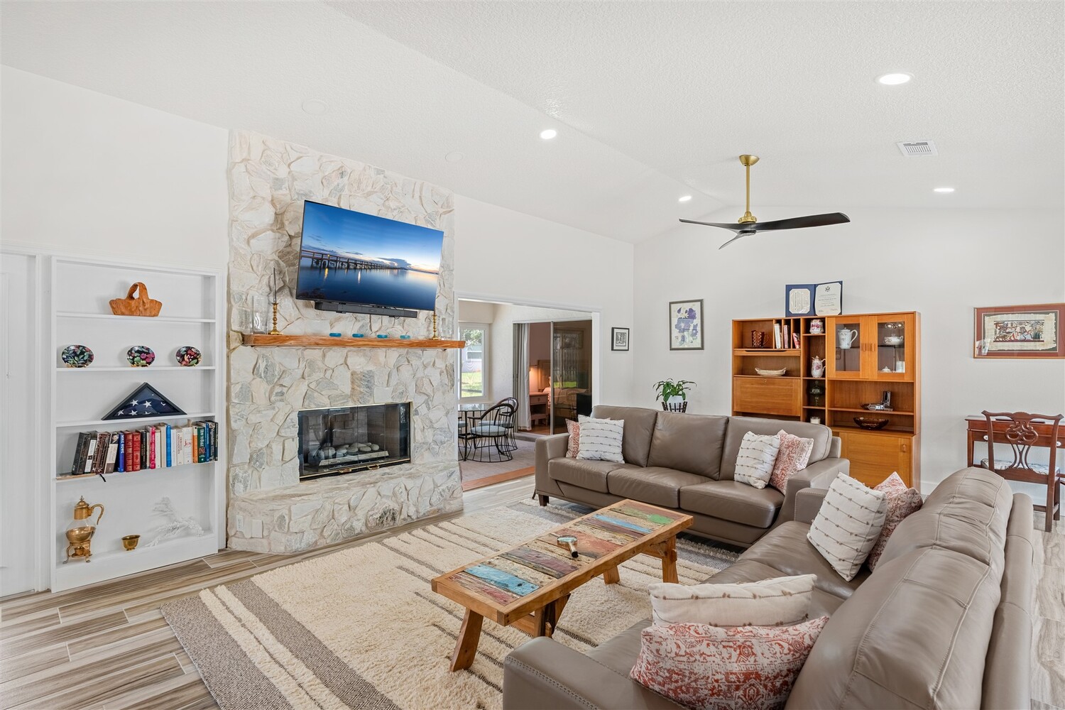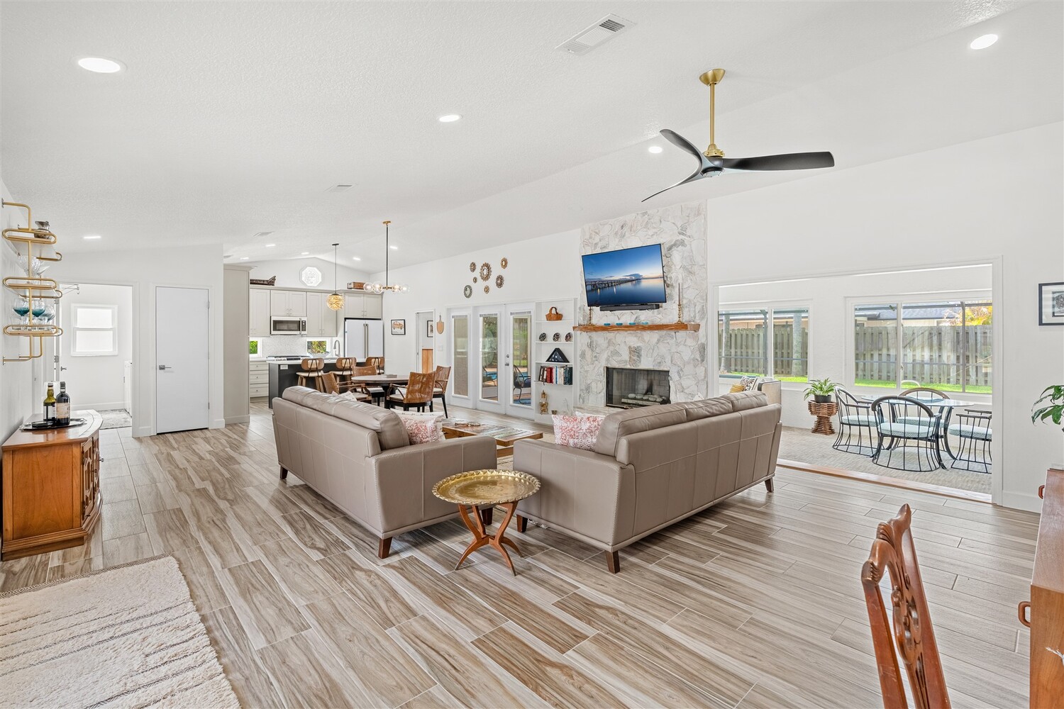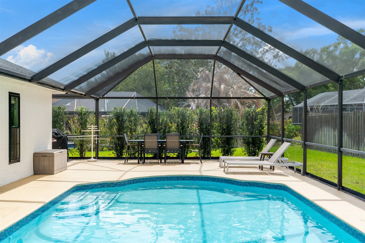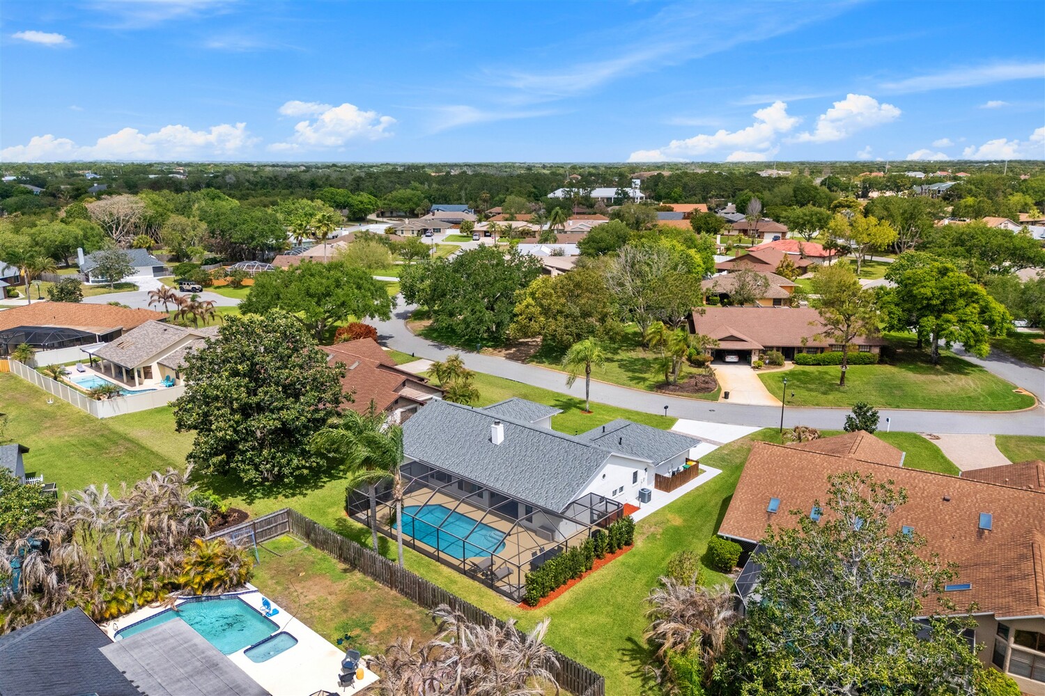 SELLER HAS ASSUMABLE VA MORTGAGE AT 2.25%. Located in the highly sought-after Crystal Lake community of Suntree, this fully remodeled, move-in ready 3-bed, 2.5 bath pool home with a 2-car garage offers the perfect combination of modern upgrades, thoughtful design, and long-term peace of mind. From the moment you arrive, the charming paved front courtyard creates a warm and inviting entry, setting the tone for the quality found throughout. Inside, the open floor plan is filled with natural light and enhanced by new flooring throughout, updated baseboards, recessed LED lighting, and designer ceiling fans. The spacious living area features a cozy gas fireplace and flows seamlessly into the dining and kitchen spaces, making it ideal for both everyday living and entertaining. The beautifully updated kitchen serves as the heart of the home, showcasing quartz countertops, new cabinetry, a stylish backsplash, and high-end appliances. A new washer and dryer add convenience, while closets and shades throughout the home provide both functionality and a polished finish. Extensive system upgrades ensure true move-in readiness, including a 2025 roof, 2020 A/C, 2021 hot water heater, and fully updated whole-house plumbing. Additional improvements include new impact windows, garage access door, front door, garage door and roll down hurricane screen on lanai, along with new electrical panel, offering safety, efficiency, and peace of mind. All three bathrooms have been fully upgraded with modern finishes, creating spa-like spaces designed for comfort. Fresh interior and exterior paint--including the garage--further enhances the home's clean, updated aesthetic. Step outside to your private backyard retreat, where a screened-in lanai surrounds the resurfaced pool. Enjoy a newly painted pool deck, gas heater, new chlorinator and pool pump, and LED lighting, along with the added convenience of an electric roll-down hurricane screen for the patio. Updated landscaping and a refreshed sprinkler system complete the outdoor space (with a gas stub out for a summer kitchen), providing both beauty and ease of maintenance. This exceptional home delivers quality, style, and an unbeatable location in one of Suntree's most desirable neighborhoods--offering the very best of Florida living.
