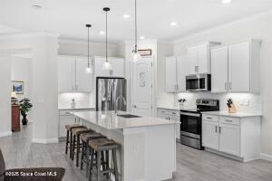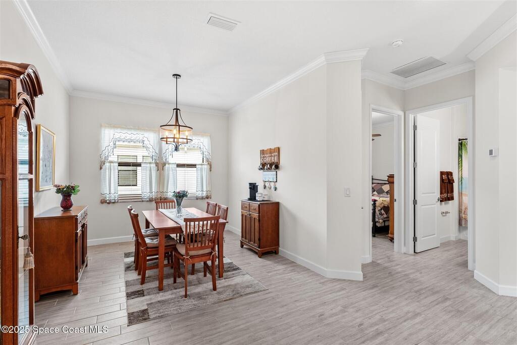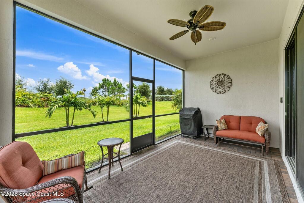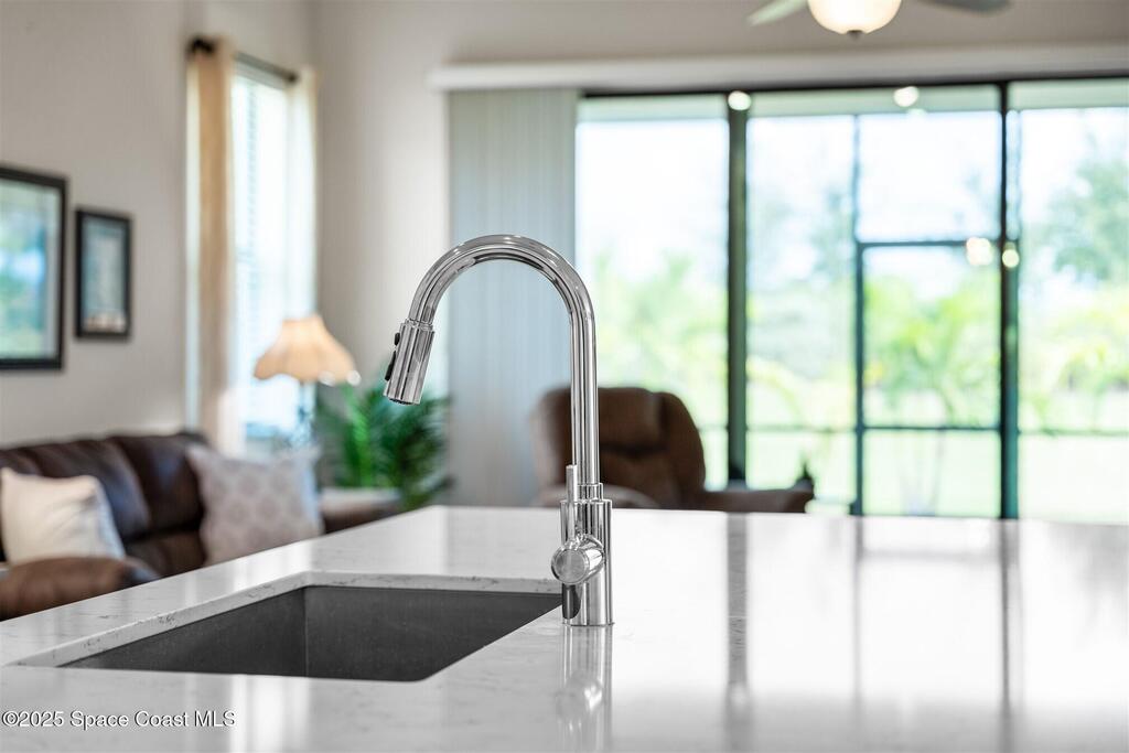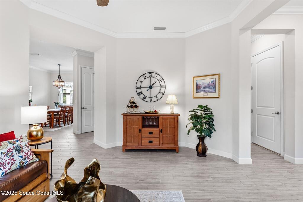 From the exterior with stone accents and inviting front porch to the screened-in lanai, this 2 bedroom plus flex room home in Bridgewater, Viera's sought after 55+ resort style community, epitomizes Florida living! Decorated in today's sought after palette of whites and grays, this ''open floor plan'' home checks off all the boxes. White kitchen cabinets, upscale backsplash, undercabinet and pendent lighting, marble look quartz counters in kitchen and baths, new porcelain tile flooring throughout (no carpet!), and elegant crown molding in main areas and bedrooms are the highlights of this home! New Palm Trees in backyard July 2025! The state-of-the-art refrigerator brews your favorite coffee before you retreat to the front porch or the screened in rear lanai. The HOA provides lawn care and includes a stunning private clubhouse, complete with heated pool and spa, fitness center, tennis and pickleball courts, billiards room and its own movie theater! Close to shopping & restaurants!