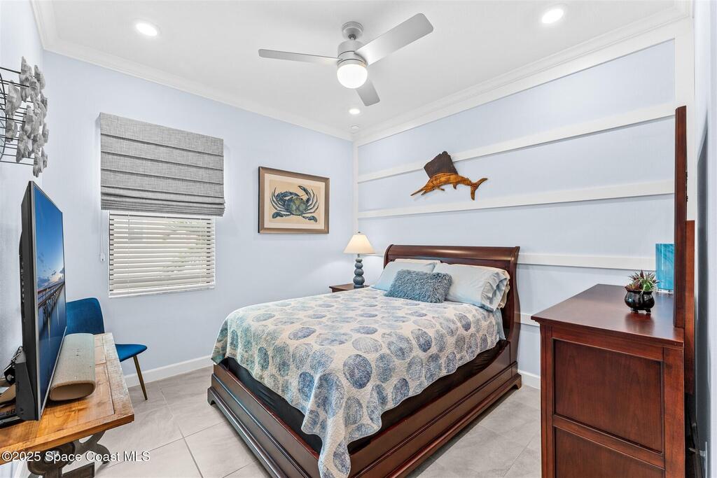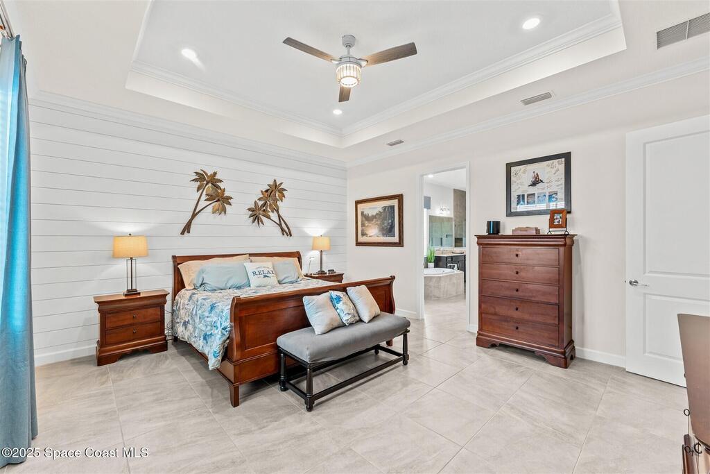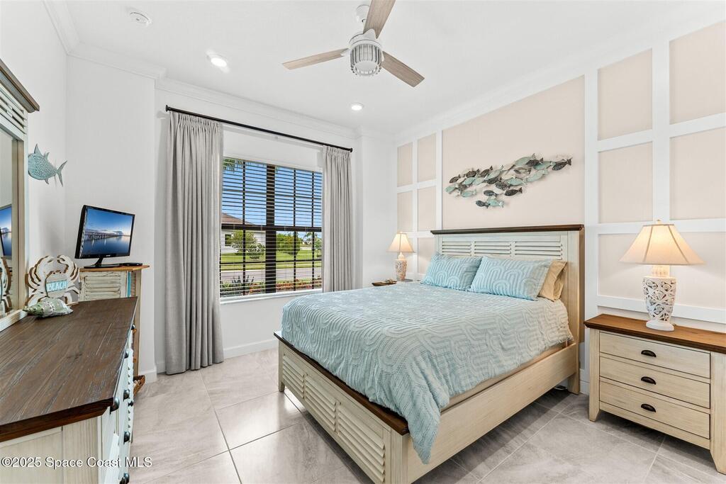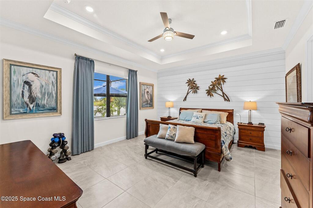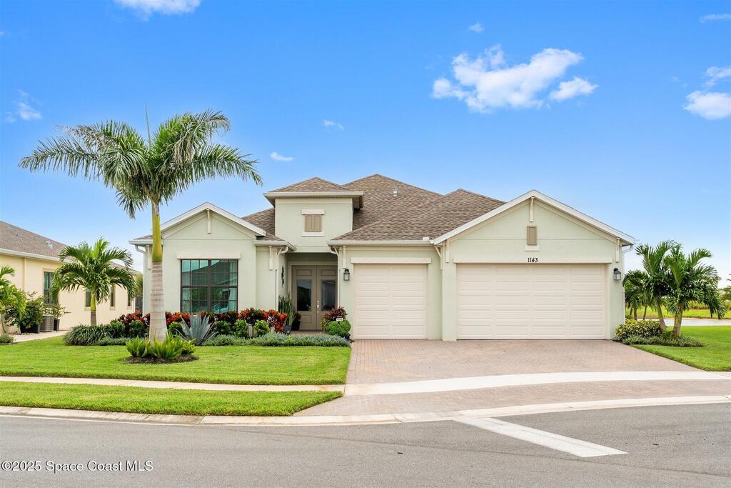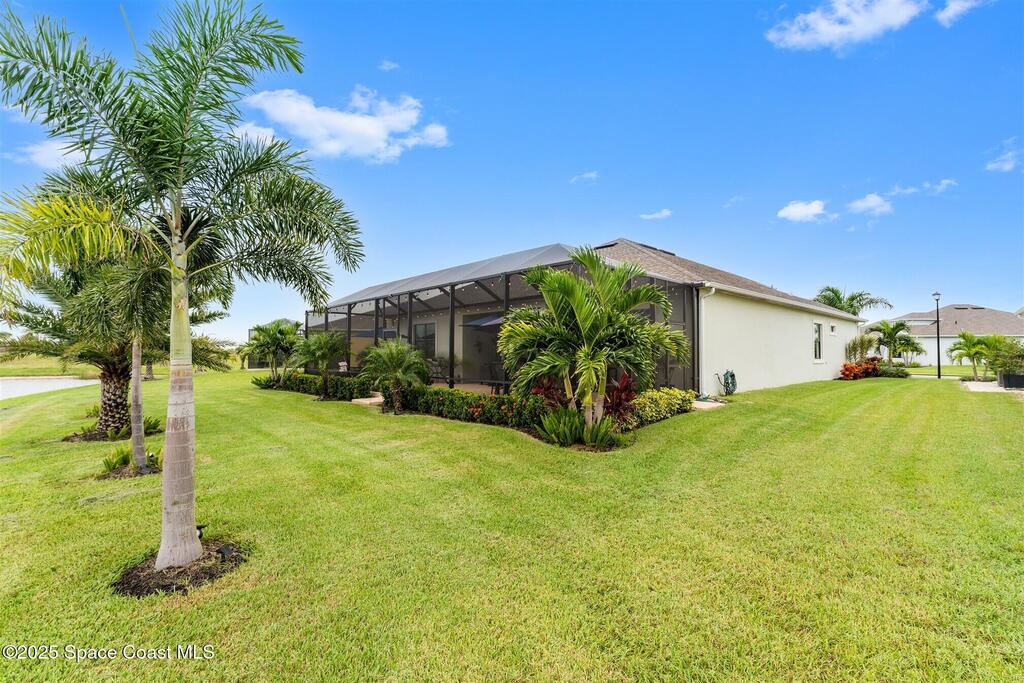 Waterfront luxury in Bridgewater, Viera's 55+ resort style gated community! This striking 3-bedroom + den, 3-bath, 3-car garage home was inspired by the builder's decorated model and features elegant upgrades such as custom shiplap accent walls and designer trim plus great room built-ins! Additional ''must-have'' features include IMPACT WINDOWS & SLIDERS, tile and crown molding throughout, a gourmet kitchen w/ wall ovens, cooktop and an oversized island. The primary suite boasts a sumptuous bath w/ walk-in shower, soaking tub, and dual walk-in custom closets. Perfect for entertaining, the great room's expansive sliders lead to a stunning 50'x15' screened lanai overlooking the water. And overnight guests enjoy their own en-suite retreat for comfort and privacy. Even the garage impresses with epoxy floors, overhead storage, and 240V outlet for an electric car. Bridgewater's private clubhouse offers a heated pool, spa, fitness center, tennis & pickleball courts, and even a movie theater