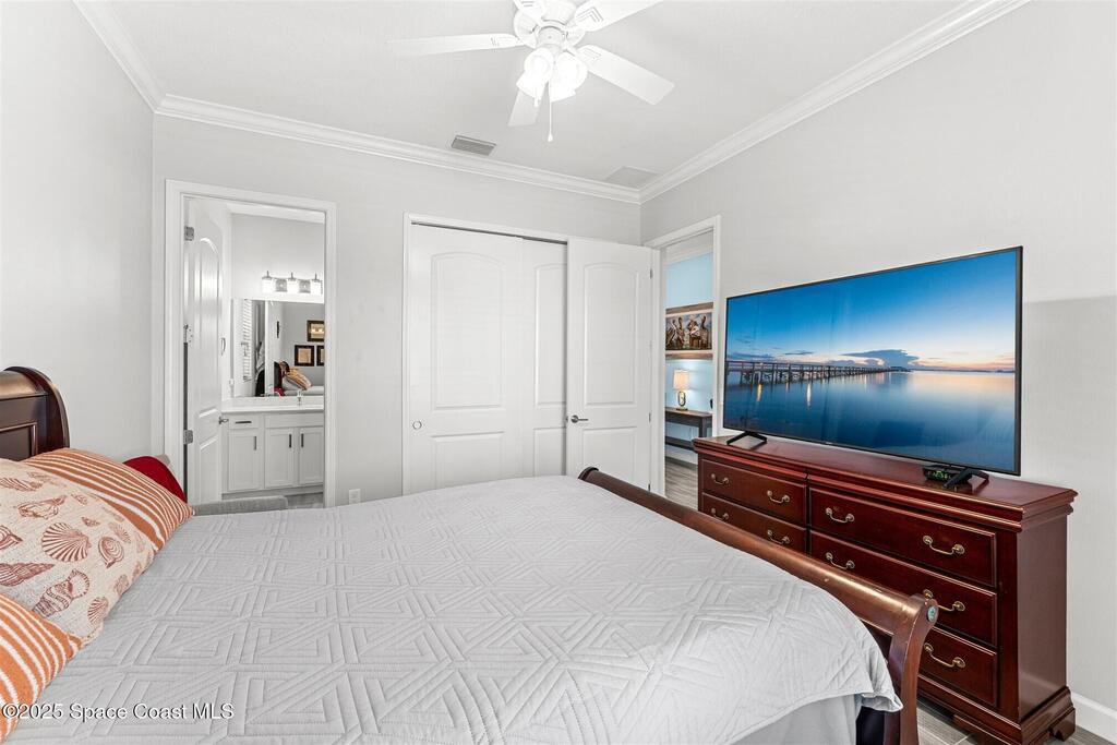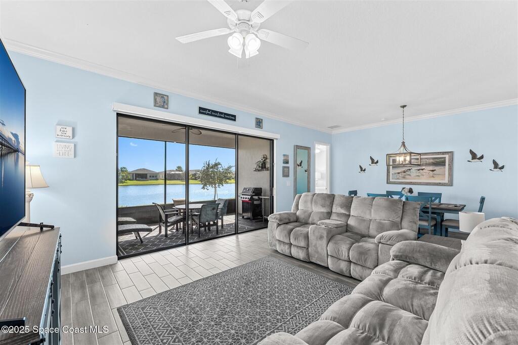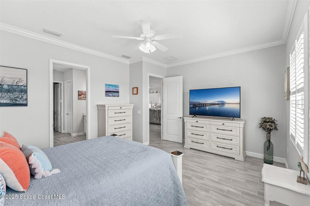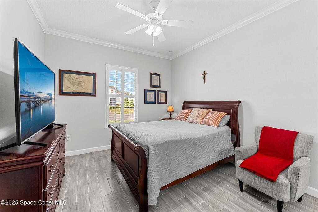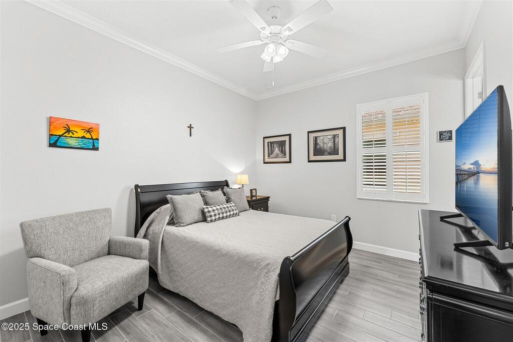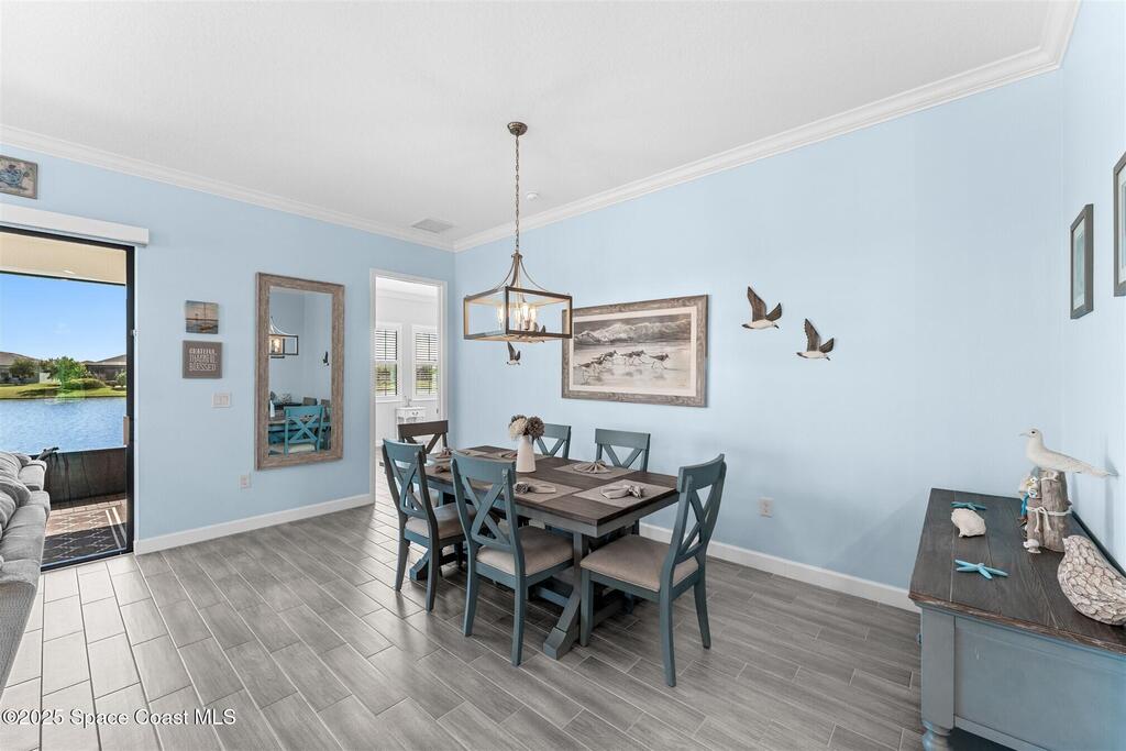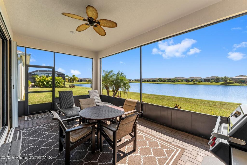Pristine 3 bedroom plus study, 3 1/2 bath home in Bridgewater, Viera's popular 55+ resort style community! Move in ready with every upgrade: new porcelain tile plank floors throughout, crown molding, plantation shutters, screened in lanai, 8' doors, epoxy garage floors and more! Perfect for guests, every bedroom is an ensuite with its own bath! Large three panel sliders in great room bring the beautiful lake views into your home and set it apart from similar key largo style homes! The outside is as meticulous as the interior with stone trim enhancing the freshly painted exterior. As you approach the home, you will notice the stone landscape beds and impact glass etched front door. Accordion shutters are on all windows and sliders and a portable generator w/transformer switch add to your peace of mind. The private clubhouse offers a large, heated pool and spa, fitness center, tennis & pickleball courts and a movie theater! Short drive to ocean beaches, cruise ships, shopping, dining!