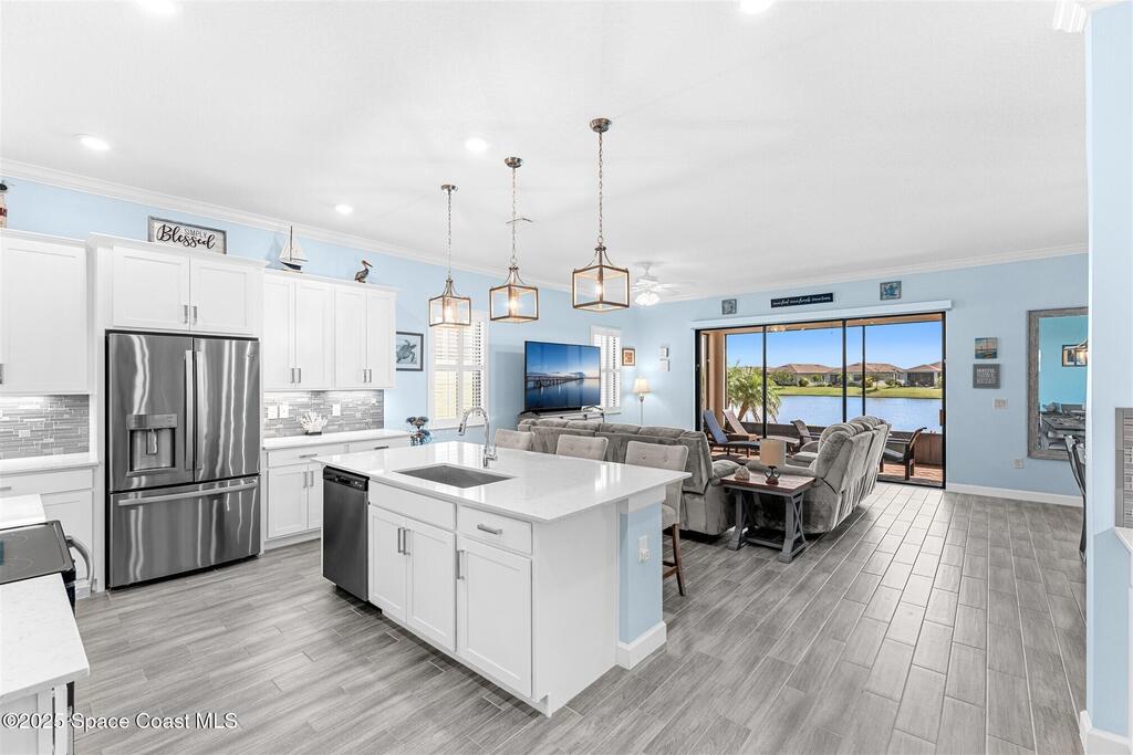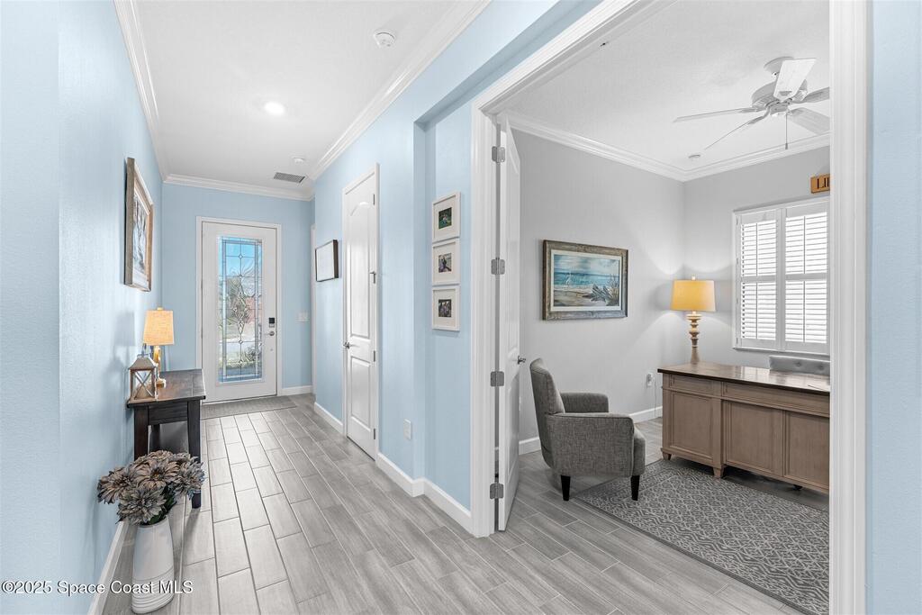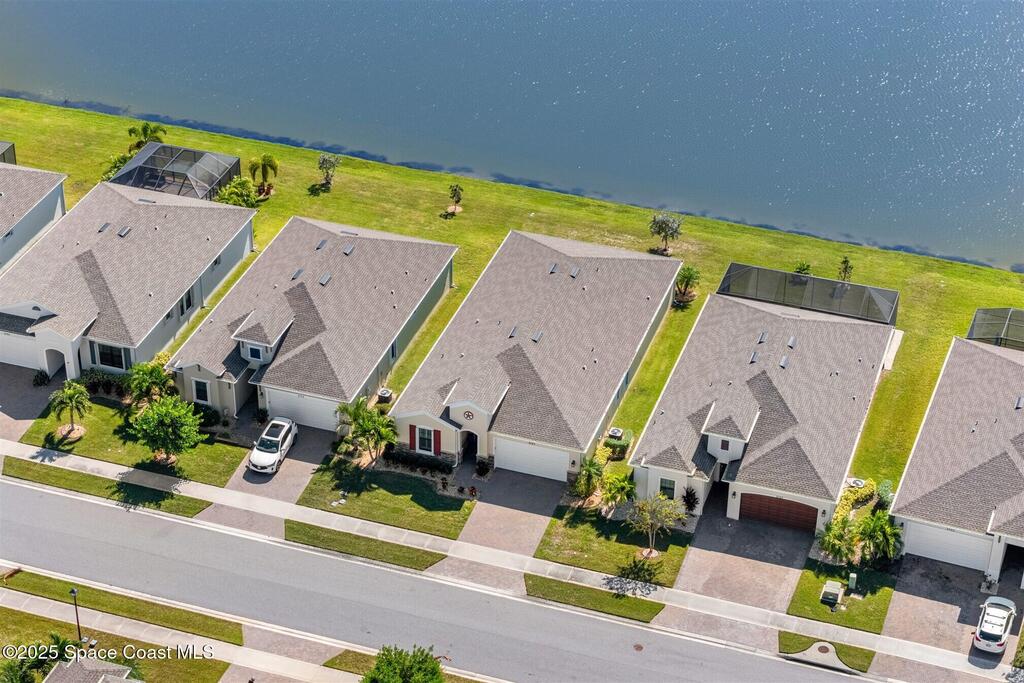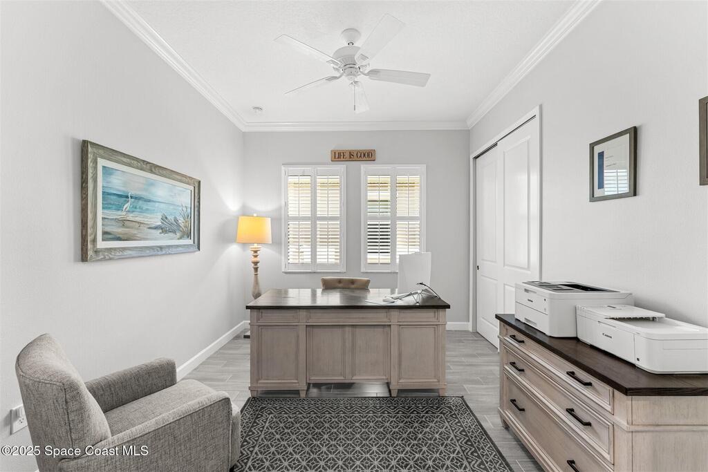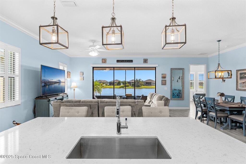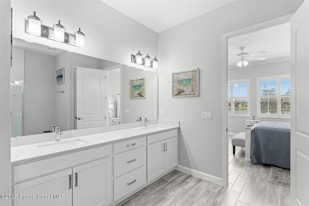 Pristine 3 bedroom plus study, 3 1/2 bath home in Bridgewater, Viera's popular 55+ resort style community! Move in ready with every upgrade: new porcelain tile plank floors throughout, crown molding, plantation shutters, screened in lanai, 8' doors, epoxy garage floors and more! Perfect for guests, every bedroom is an ensuite with its own bath! Large three panel sliders in great room bring the beautiful lake views into your home and set it apart from similar key largo style homes! The outside is as meticulous as the interior with stone trim enhancing the freshly painted exterior. As you approach the home, you will notice the stone landscape beds and impact glass etched front door. Accordion shutters are on all windows and sliders and a portable generator w/transformer switch add to your peace of mind. The private clubhouse offers a large, heated pool and spa, fitness center, tennis & pickleball courts and a movie theater! Short drive to ocean beaches, cruise ships, shopping, dining!