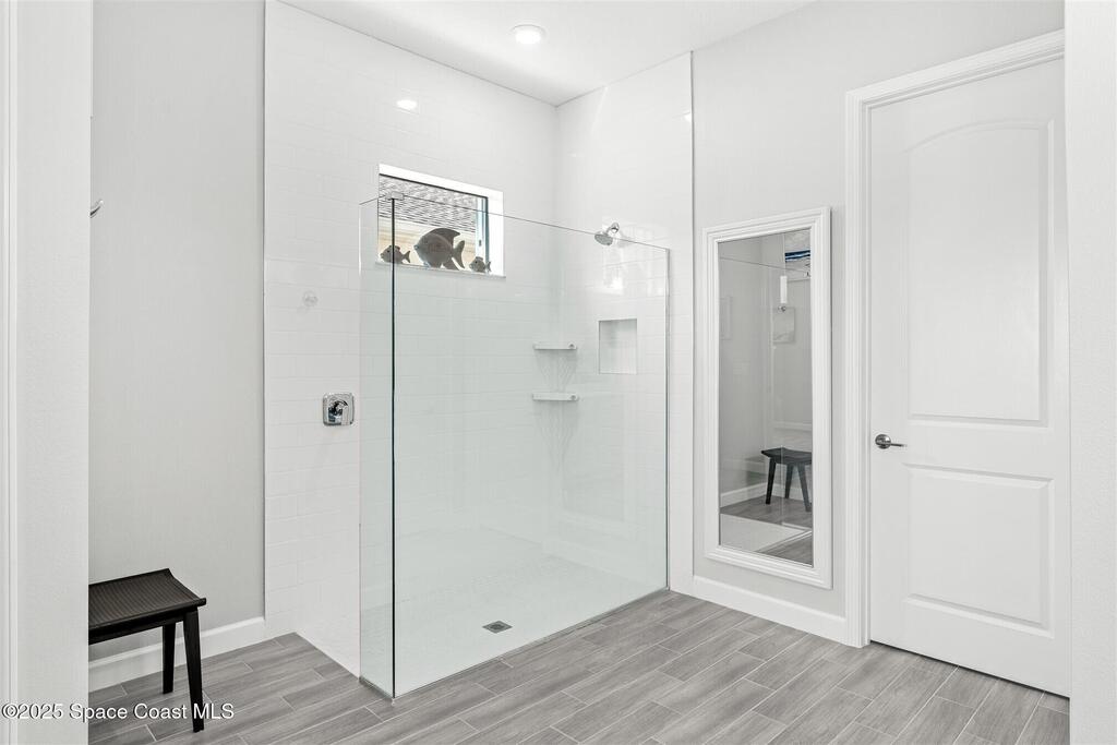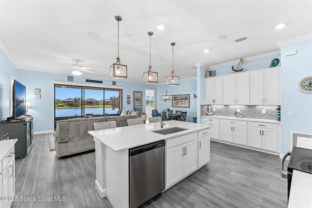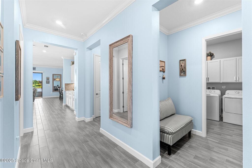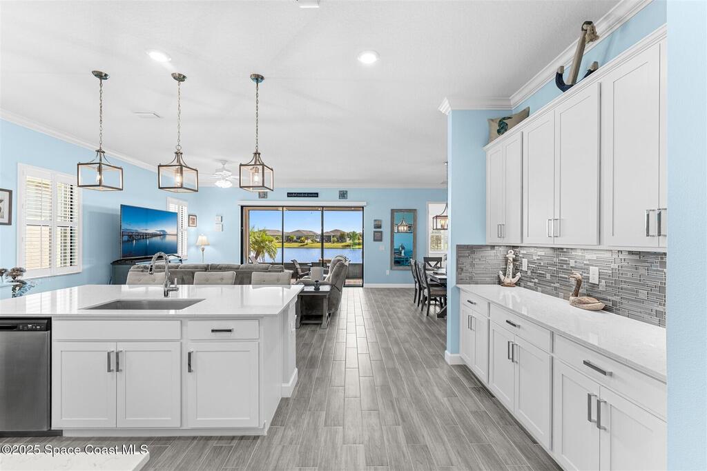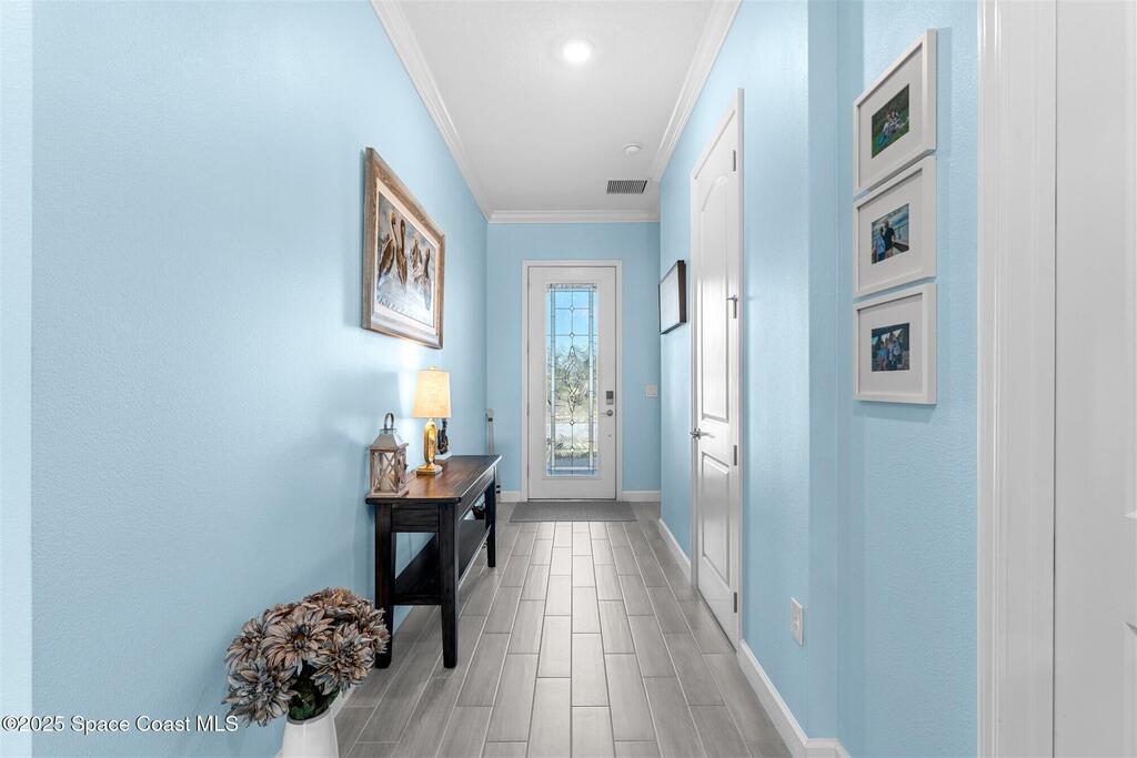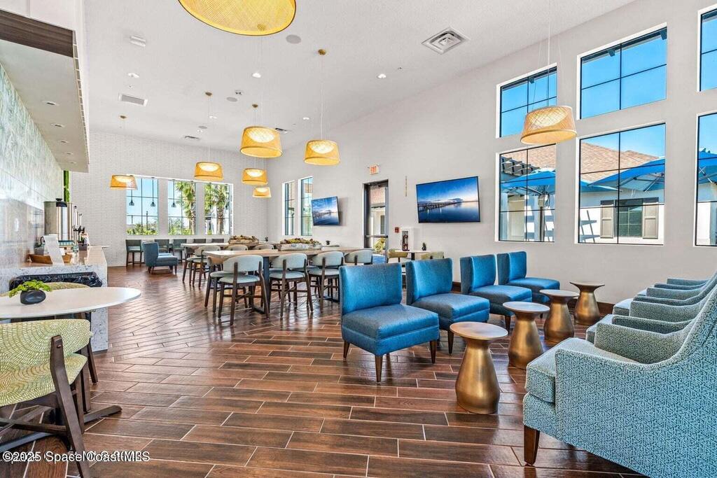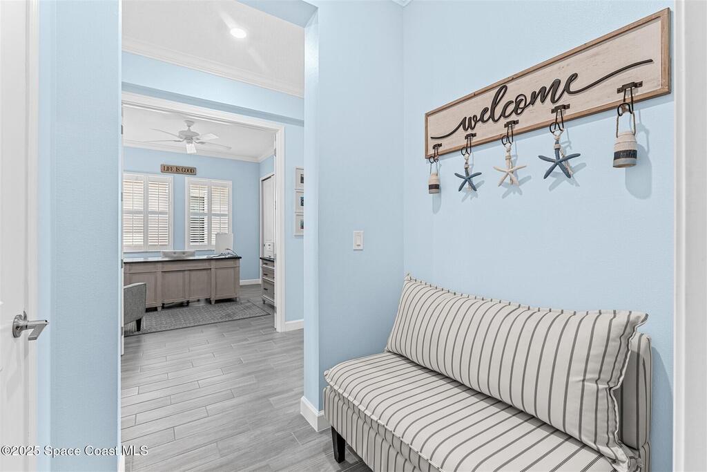 Pristine 3 bedroom plus study, 3 1/2 bath home in Bridgewater, Viera's popular 55+ resort style community! Move in ready with every upgrade: new porcelain tile plank floors throughout, crown molding, plantation shutters, screened in lanai, 8' doors, epoxy garage floors and more! Perfect for guests, every bedroom is an ensuite with its own bath! Large three panel sliders in great room bring the beautiful lake views into your home and set it apart from similar key largo style homes! The outside is as meticulous as the interior with stone trim enhancing the freshly painted exterior. As you approach the home, you will notice the stone landscape beds and impact glass etched front door. Accordion shutters are on all windows and sliders and a portable generator w/transformer switch add to your peace of mind. The private clubhouse offers a large, heated pool and spa, fitness center, tennis & pickleball courts and a movie theater! Short drive to ocean beaches, cruise ships, shopping, dining!