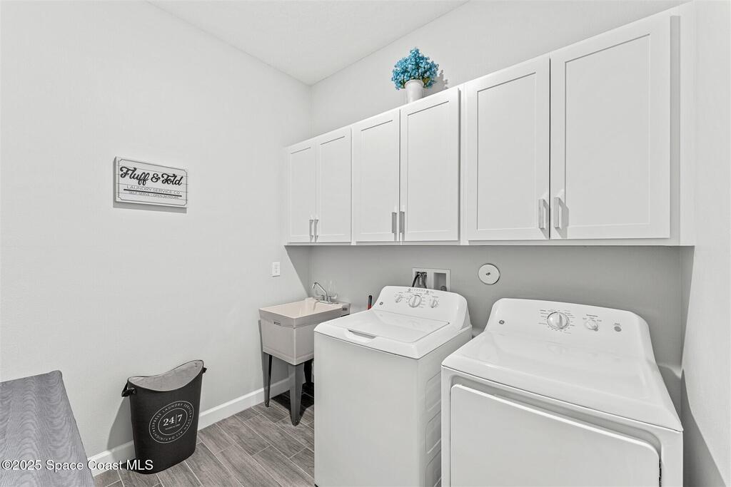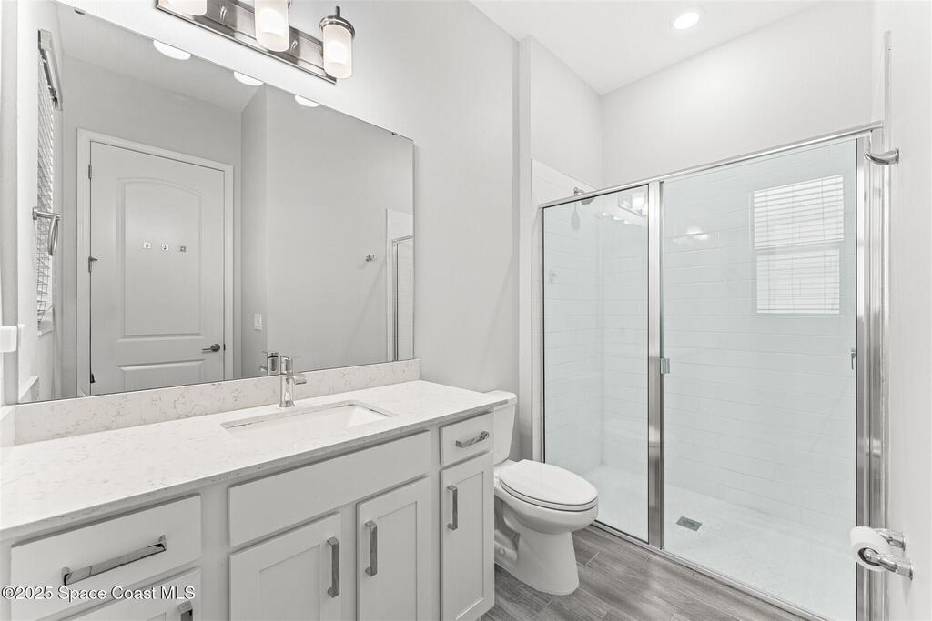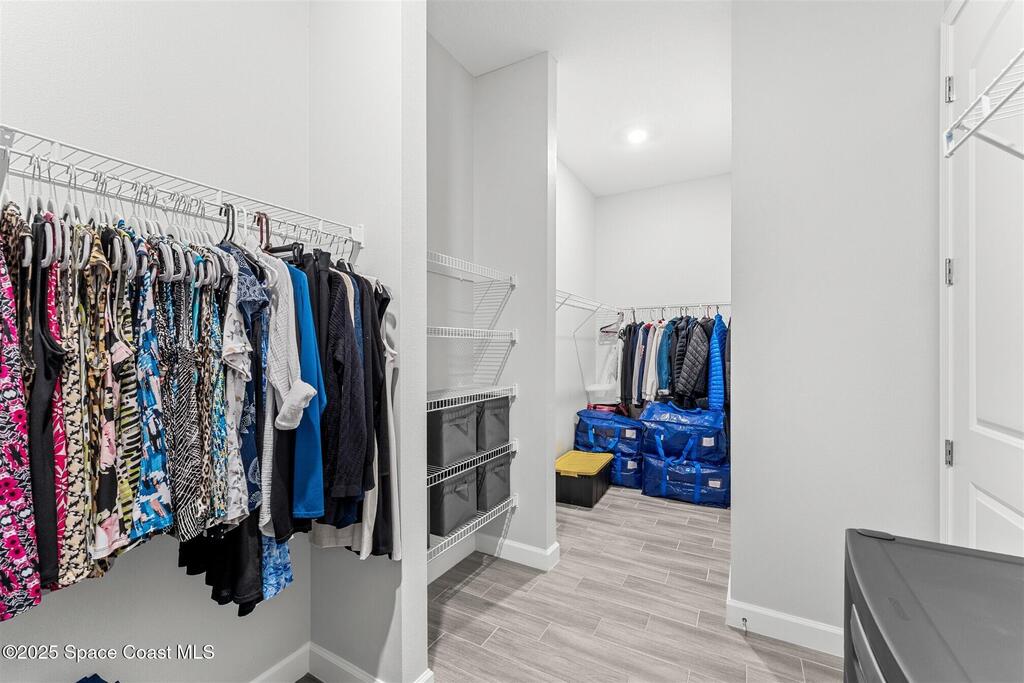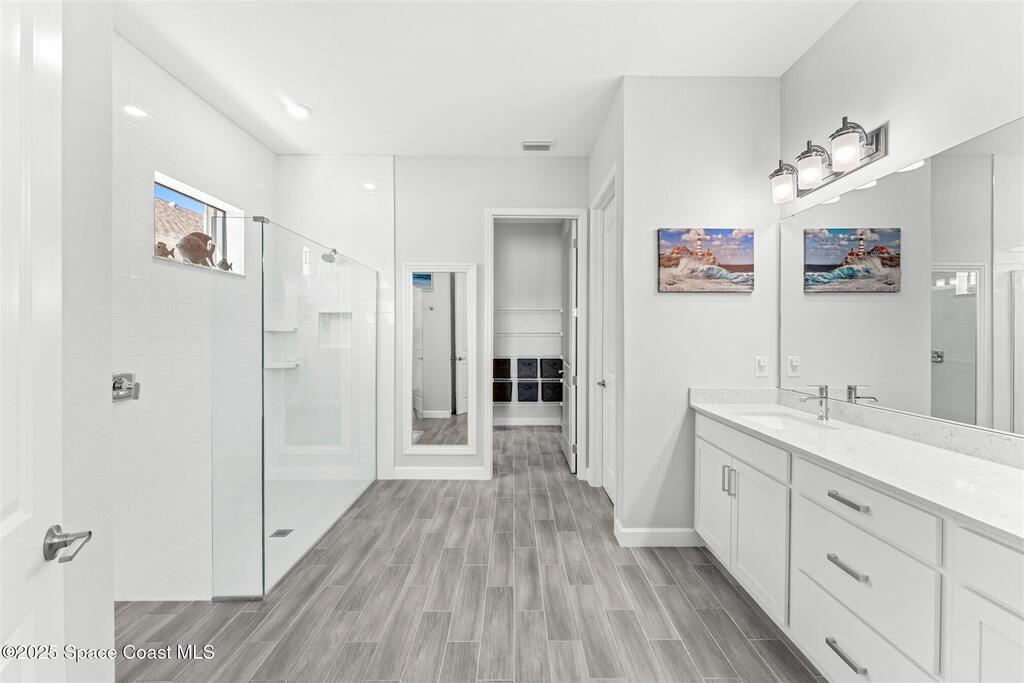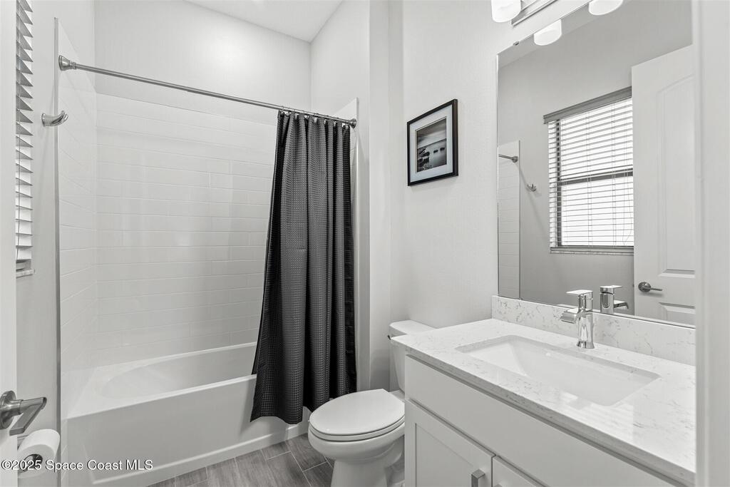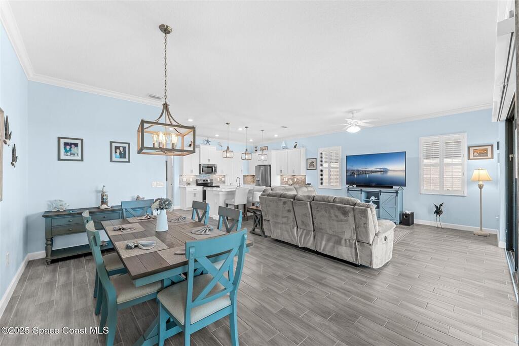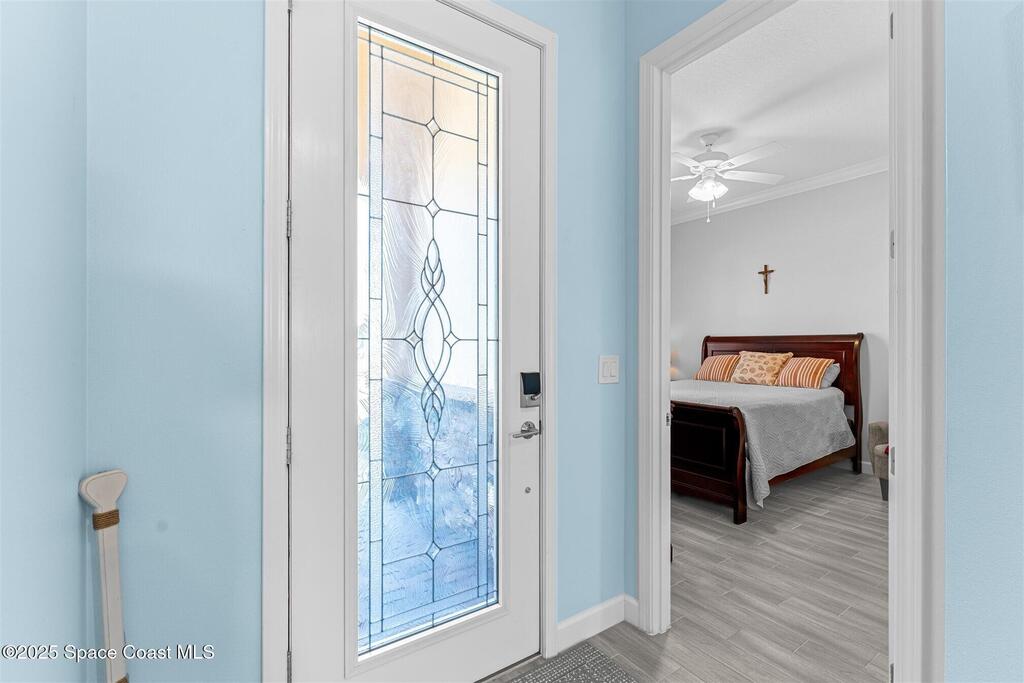Pristine 3 bedroom plus study, 3 1/2 bath home in Bridgewater, Viera's popular 55+ resort style community! Move in ready with every upgrade: new porcelain tile plank floors throughout, crown molding, plantation shutters, screened in lanai, 8' doors, epoxy garage floors and more! Perfect for guests, every bedroom is an ensuite with its own bath! Large three panel sliders in great room bring the beautiful lake views into your home and set it apart from similar key largo style homes! The outside is as meticulous as the interior with stone trim enhancing the freshly painted exterior. As you approach the home, you will notice the stone landscape beds and impact glass etched front door. Accordion shutters are on all windows and sliders and a portable generator w/transformer switch add to your peace of mind. The private clubhouse offers a large, heated pool and spa, fitness center, tennis & pickleball courts and a movie theater! Short drive to ocean beaches, cruise ships, shopping, dining!