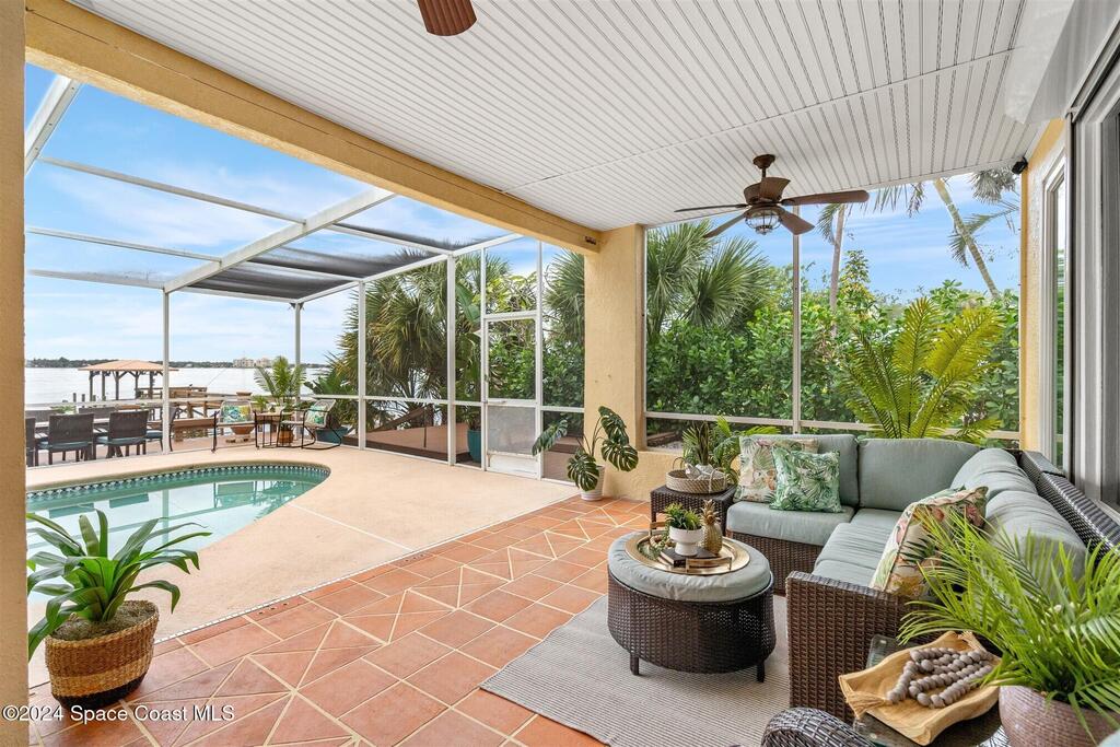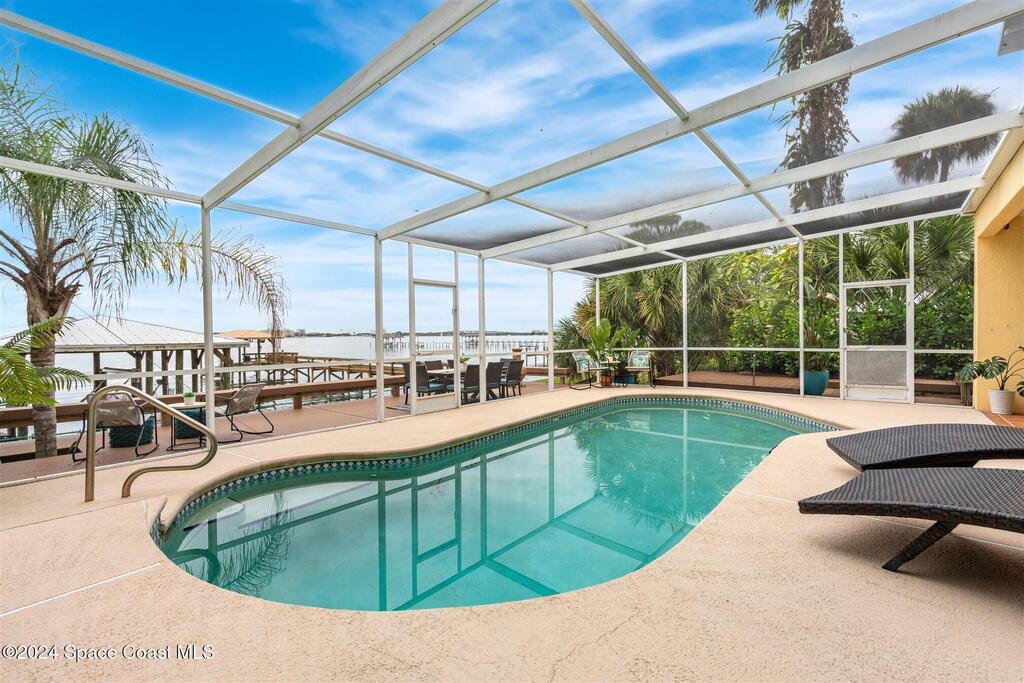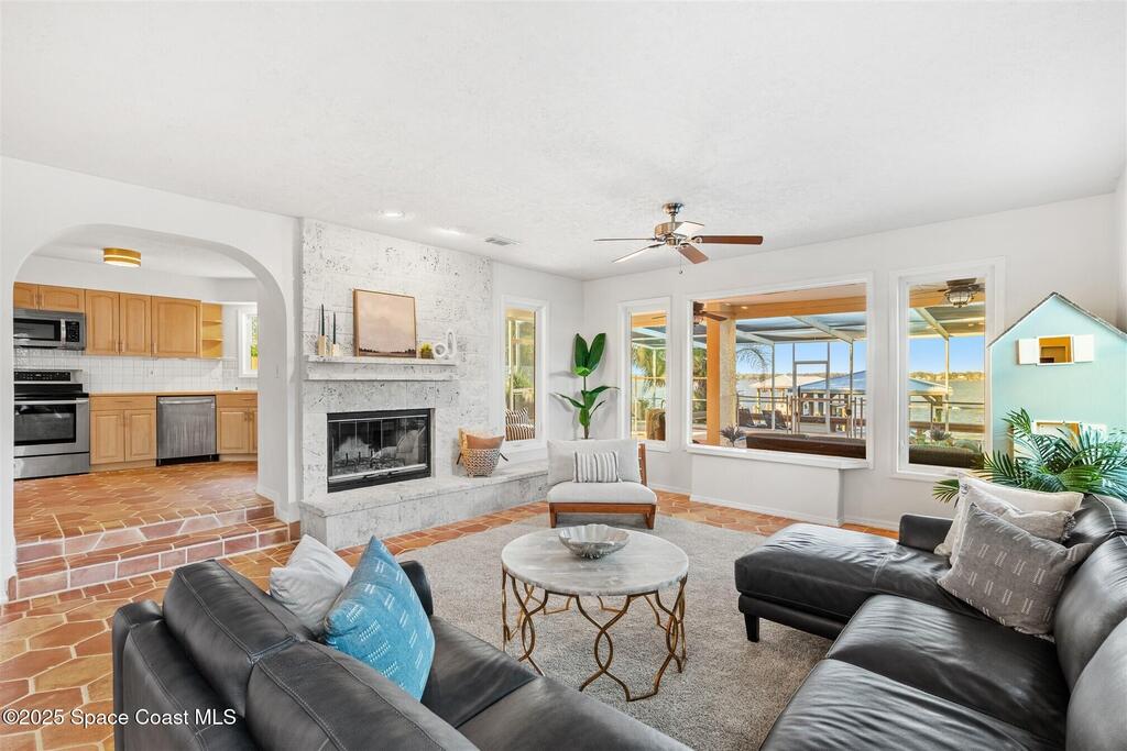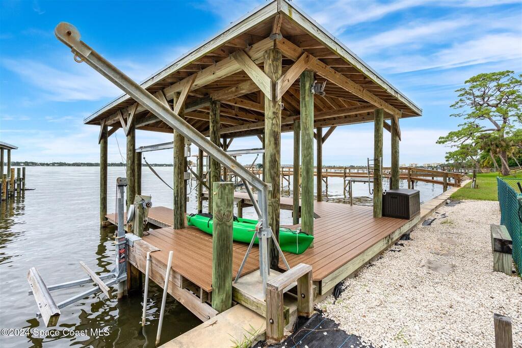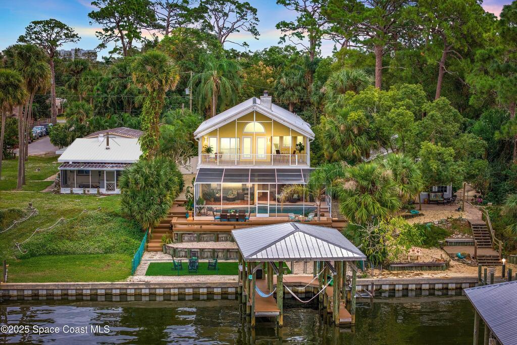 Incredible waterfront opportunity--13 feet above sea level with NO flood insurance required! This spacious 3,960 sq ft home features 4 bedrooms, 3.5 baths, an office, loft, and bonus room, offering versatile space for families or multigenerational living. Boaters will love the covered dock with 6,000 lb boat lift, jet ski lift, and composite decking, all overlooking the Indian River. Enjoy direct river frontage, and easy access to sandbar islands, dockside restaurants, and more. The home features a private in-law suite with its own entrance, kitchen, living room, bedroom, and bath--perfect for guests or rental income. Upstairs, the luxurious primary suite offers floor-to-ceiling windows, private balcony, jacuzzi tub, and walk-in shower overlooking the water. A coral stone fireplace, tankless gas water heater, stainless steel appliances, and new metal roof (2022) add both charm and function. See ''MORE''