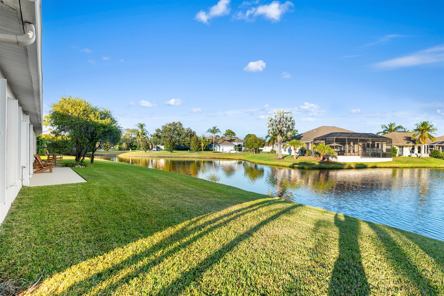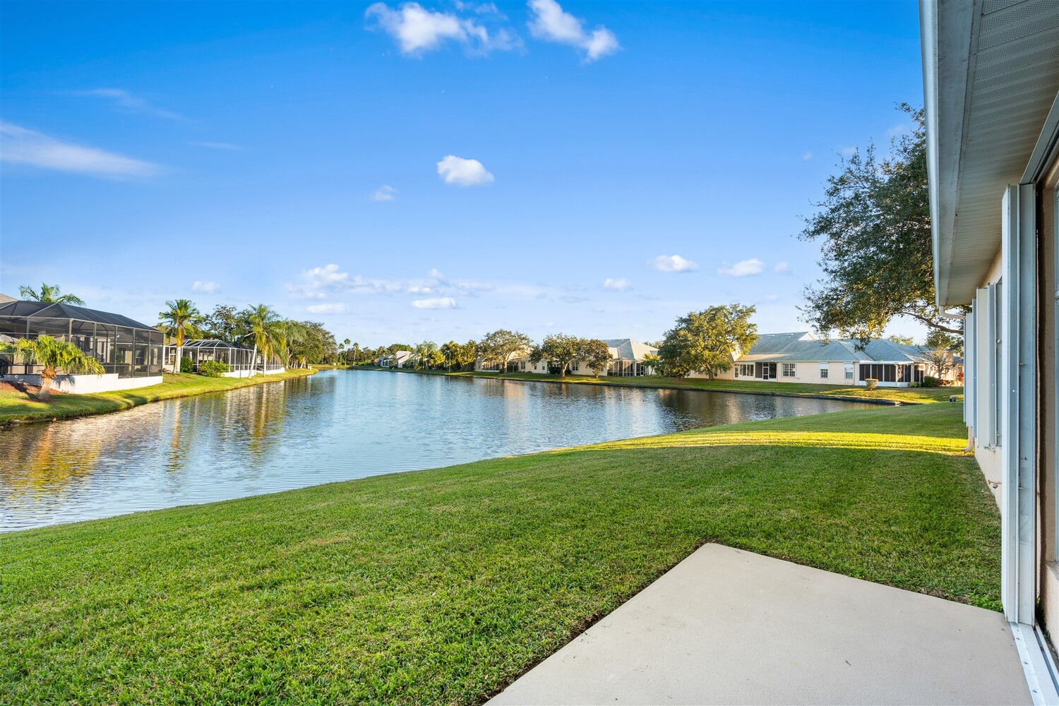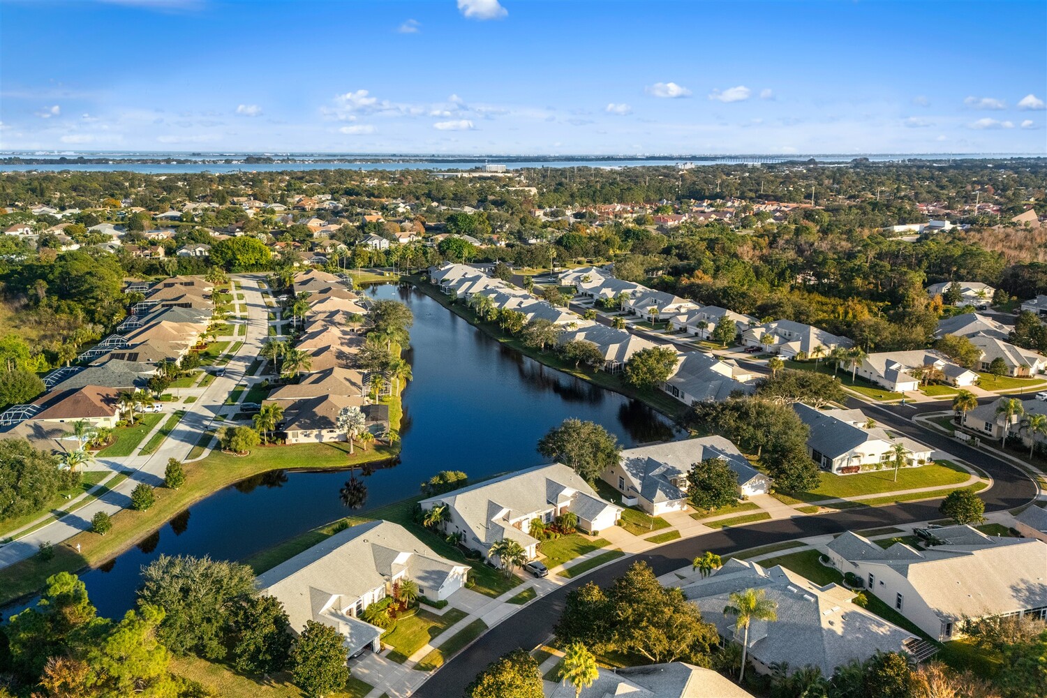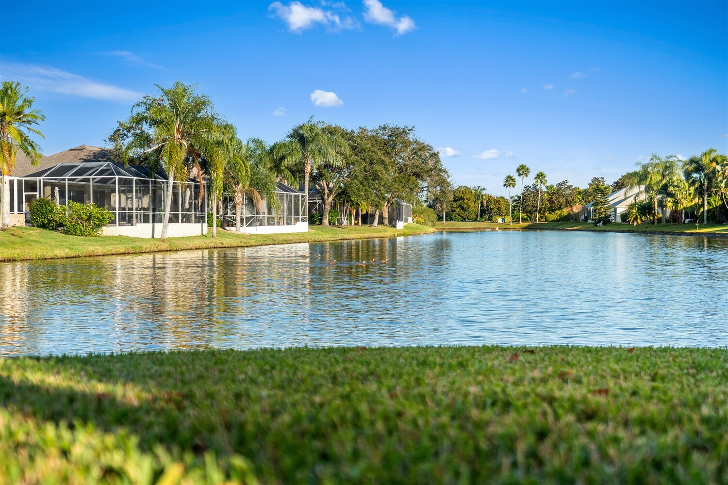 Enter through the community gate of Magnolia Pointe in Suntree and follow around to this 3-bedroom, 2-bath, 2-car garage home with water views! This popular one level floor plan has upgrades that include: granite countertops, new shower in hall bathroom, 140 sq. ft. porch with air (total sq. footage= 1,921), engineered wood flooring by Classic Wood Floors in the main living areas and all bedrooms (no carpet). Enjoy the east facing views and watch the ducks and wildlife on the waterway from the patio, porch, great room or primary bedroom. This half-duplex offers a low-maintenance lifestyle which includes lawn and sprinkler care, roof replacement, exterior painting, exterior insurance and more. A community pool and cabana complete the picture for a great lifestyle in a quiet community near shopping and restaurants. Original owners leaving their much-loved home and community to be closer to children. Roof (2016 by HOA), Water Heater (2014, HVAC (2016)