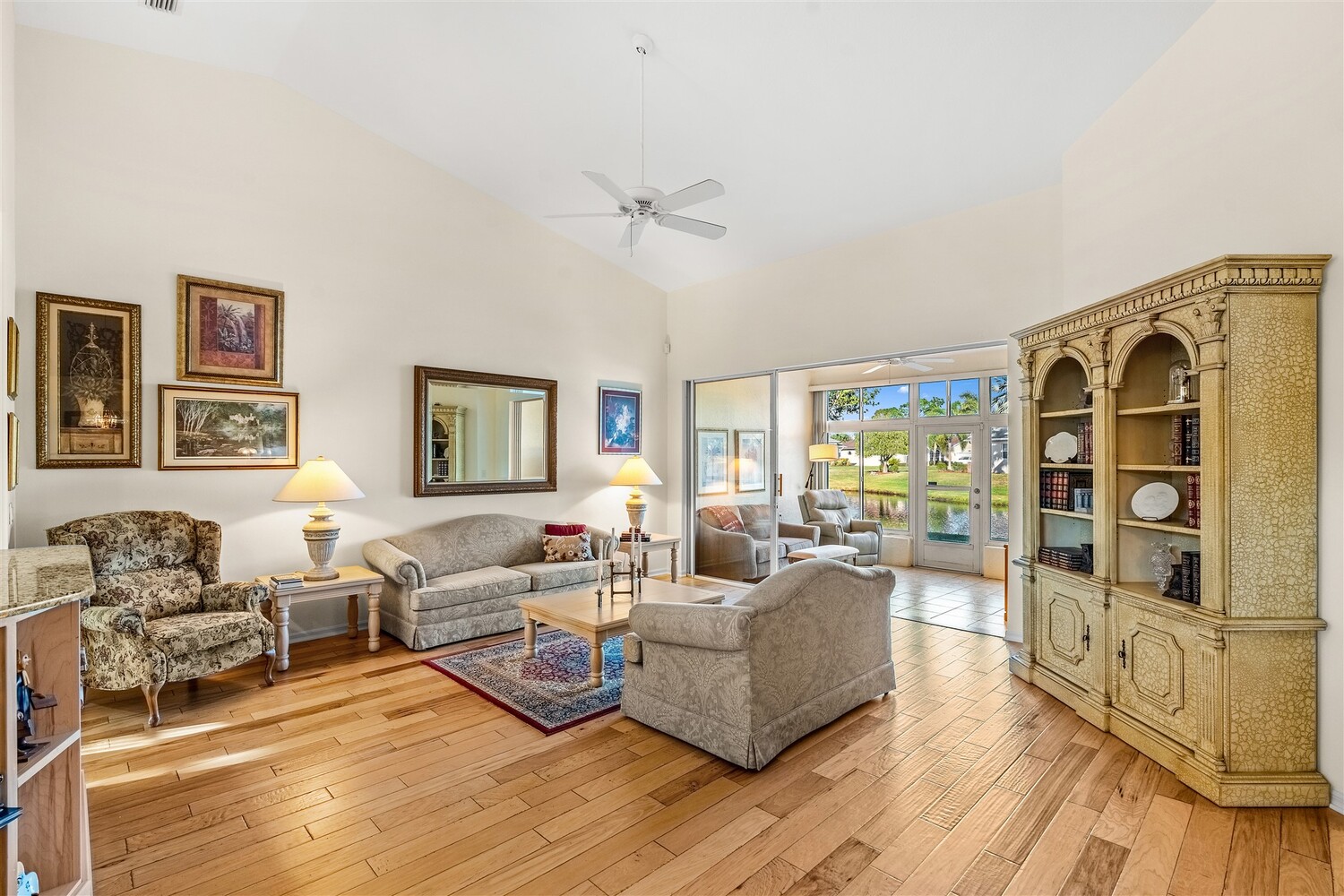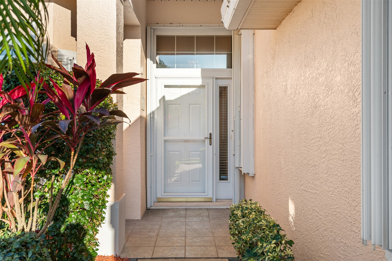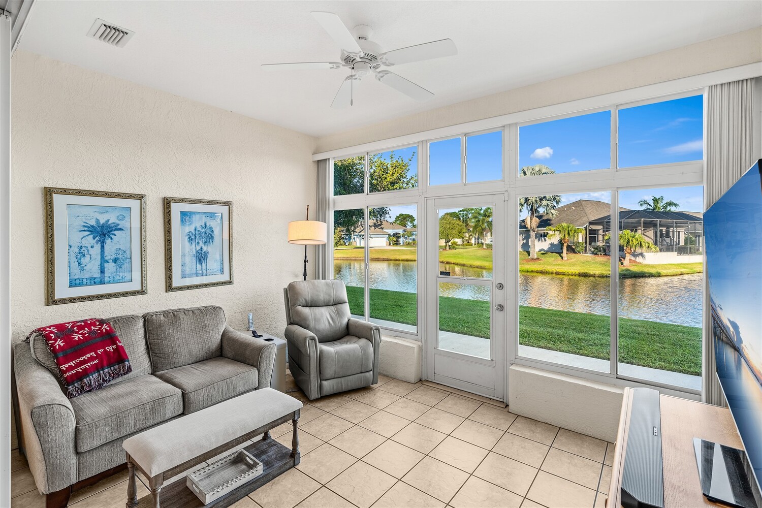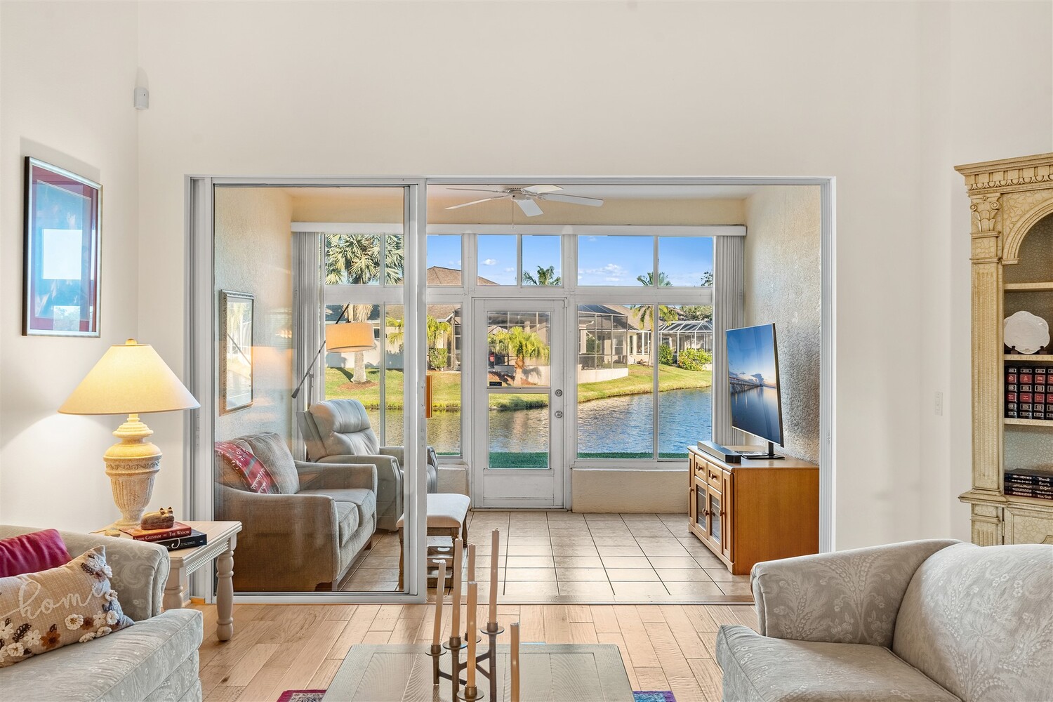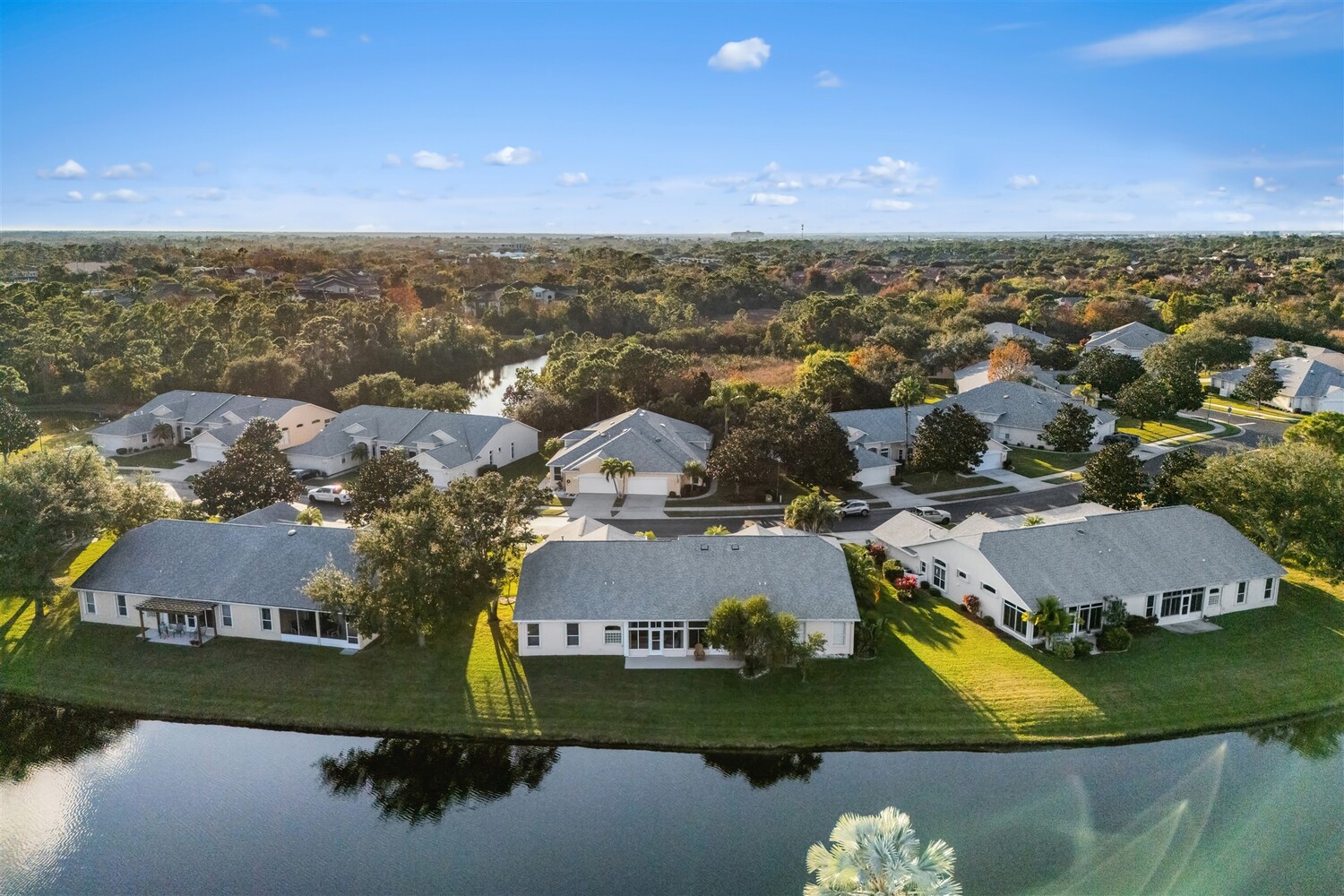 Enter through the community gate of Magnolia Pointe in Suntree and follow around to this 3-bedroom, 2-bath, 2-car garage home with water views! This popular one level floor plan has upgrades that include: granite countertops, new shower in hall bathroom, 140 sq. ft. porch with air (total sq. footage= 1,921), engineered wood flooring by Classic Wood Floors in the main living areas and all bedrooms (no carpet). Enjoy the east facing views and watch the ducks and wildlife on the waterway from the patio, porch, great room or primary bedroom. This half-duplex offers a low-maintenance lifestyle which includes lawn and sprinkler care, roof replacement, exterior painting, exterior insurance and more. A community pool and cabana complete the picture for a great lifestyle in a quiet community near shopping and restaurants. Original owners leaving their much-loved home and community to be closer to children. Roof (2016 by HOA), Water Heater (2014, HVAC (2016)