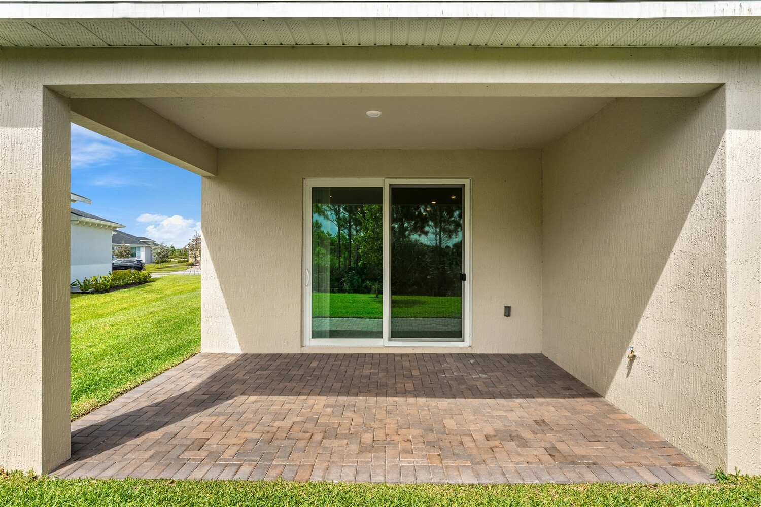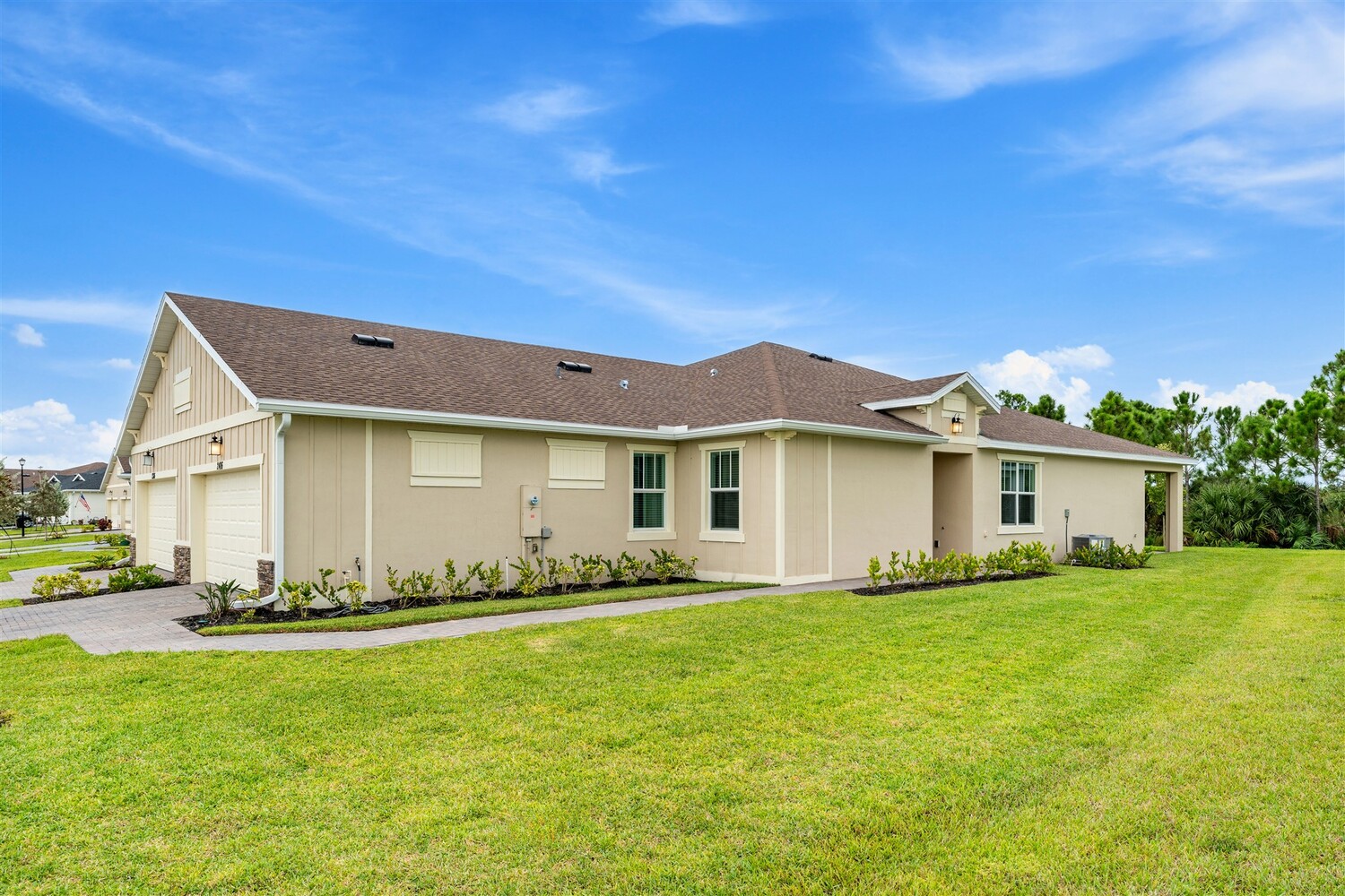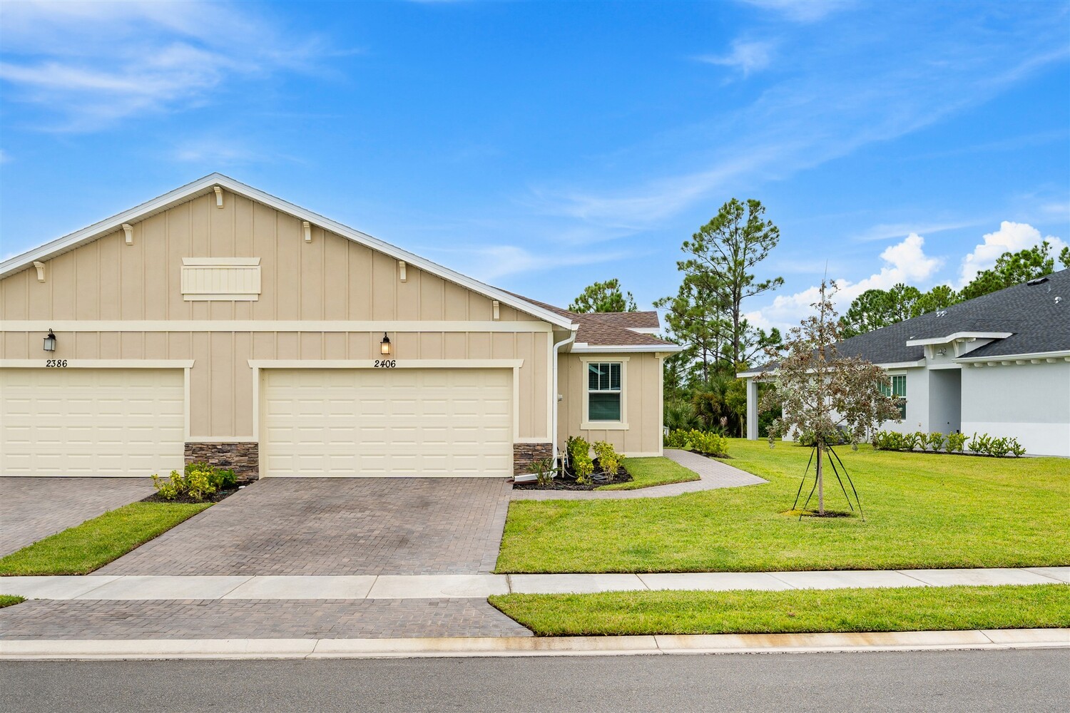Must See, less than one year old, 1794 sq ft, 3 bedroom plus flex area, 2 bath, 2 car garage home in The Timbers at Everland, the sought after 55+ resort style community in Northwest Palm Bay! Move right in, all the recently purchased FURNITURE stays with the home!! This 2024 built meticulous home backs up to a lush private conservation area and includes IMPACT WINDOWS and SLIDER, which make hurricane season stress free! Must have features including white kitchen cabinets with marble look quartz counters, tile throughout, and window blinds throughout are included in this beautiful home! Unwind at the soon to open (late September 2025) private clubhouse, featuring a large heated pool and spa, fitness room, aerobics studio, card room, dog park, putting green, fishing dock, tennis and pickle ball courts, bocce, and even a movie theater! And the HOA covers your home's lawn care! Short car ride to Atlantic beaches! Close to shopping and dining. One hour drive to MCO, cruise port!
