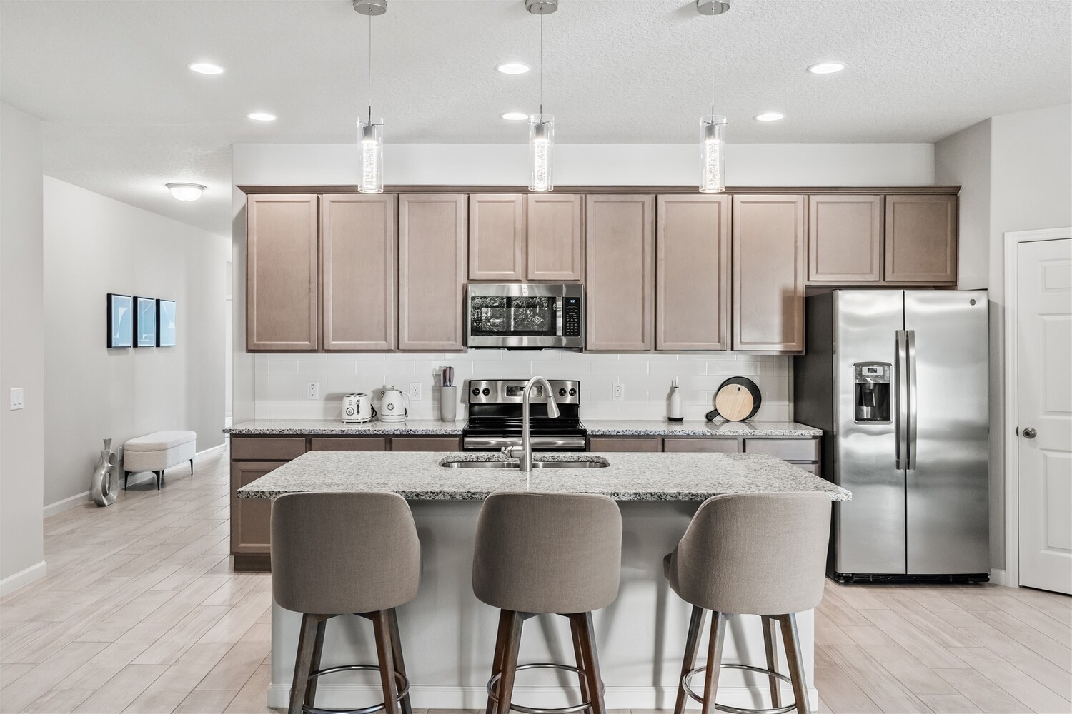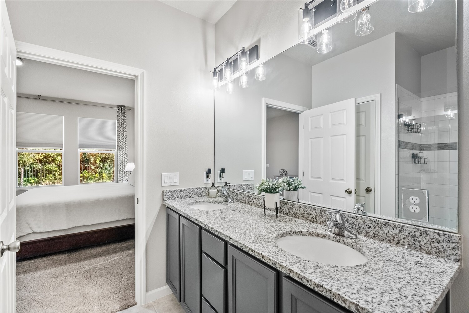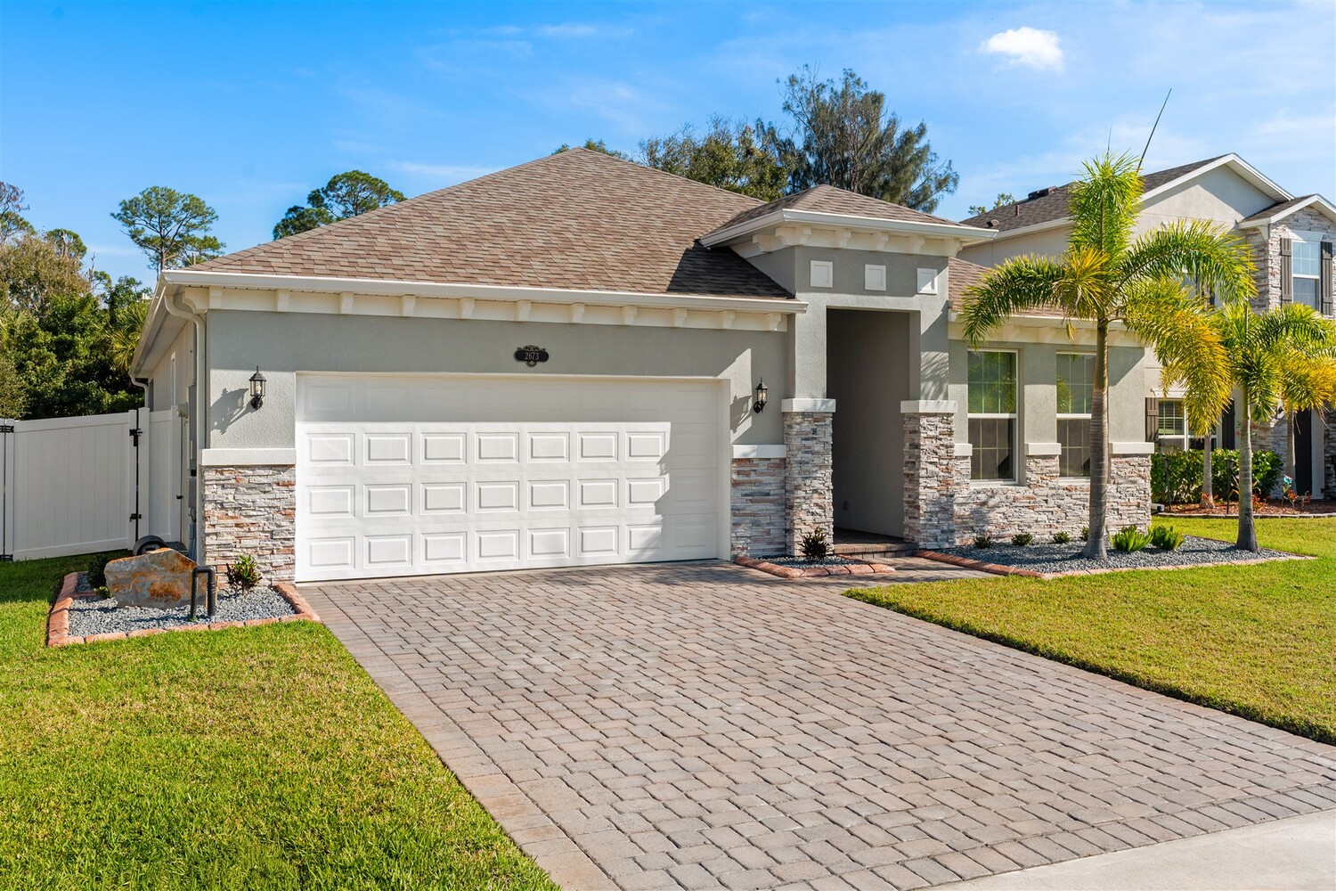 Better than new! Located in a gated community and backing to quiet greenery, this light and bright home in West Melbourne offers cozy charm paired perfectly with contemporary amenities. From the moment you arrive, you'll appreciate the modern elevation with paver drive, stone accents, and clean lines. Open the custom front door to find plenty of natural light shining through, allowing immediate access to the bedrooms and leading to the heart of the home. The deluxe kitchen features granite counters, pantry, ample cabinetry, and stainless steel appliances, perfect for entertaining and intimate family gatherings alike. The private primary suite has a custom shower and sizeable closet. All bathrooms feature granite counters and lovely cabinetry! This desirable community in West Melbourne gives you easy access to A-Rated schools, parks, shopping, dining, and is just a short drive to L3Harris, Northrop Grumman and the airport.